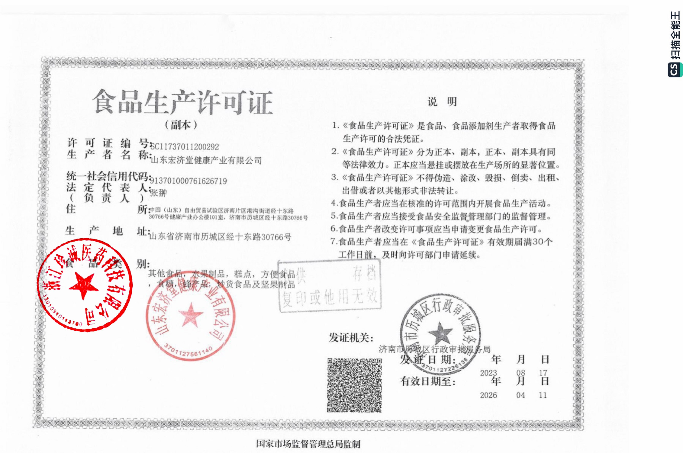 | 3 | Z99004544 | 山东宏济堂制药集团股份有限公司 | 食品生产许可证.jpg | Sep 9, 2025 1:41:43 PM | 查看下载 | |