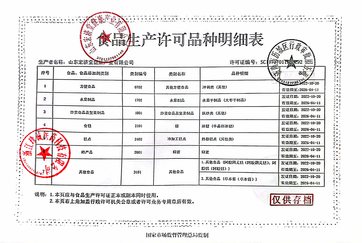 | 1 | Z99004544 | 山东宏济堂制药集团股份有限公司 | 食品生产许可证品种明细.png | Sep 9, 2025 1:41:43 PM | 查看下载 | |