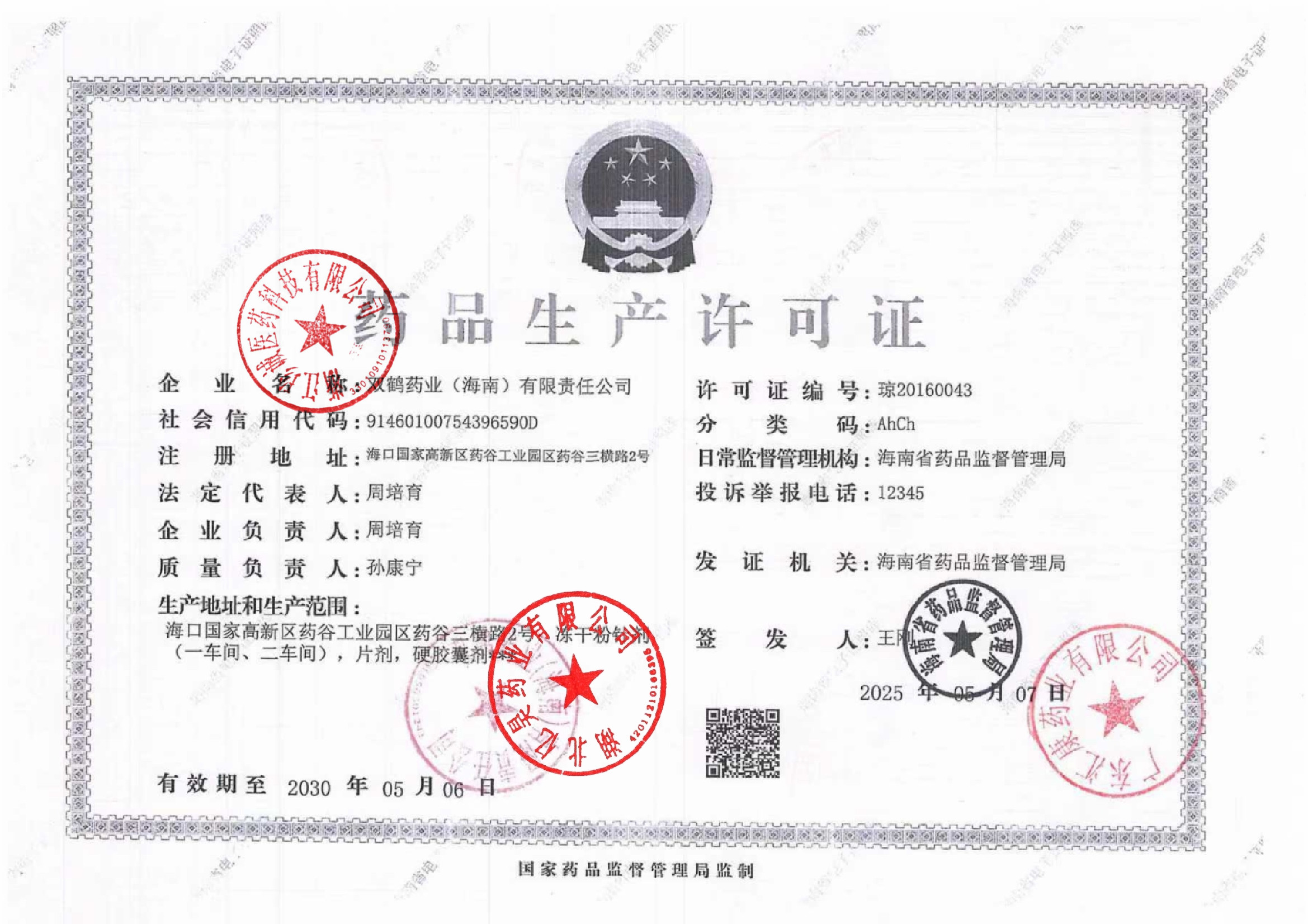 1 Z99004656 双鹤药业(海南)有限责任公司(原海南中化联合制药工业股份有限公司) 药品生产许可证0001.jpg Nov 14, 2025 9:50:06 AM 查看下载