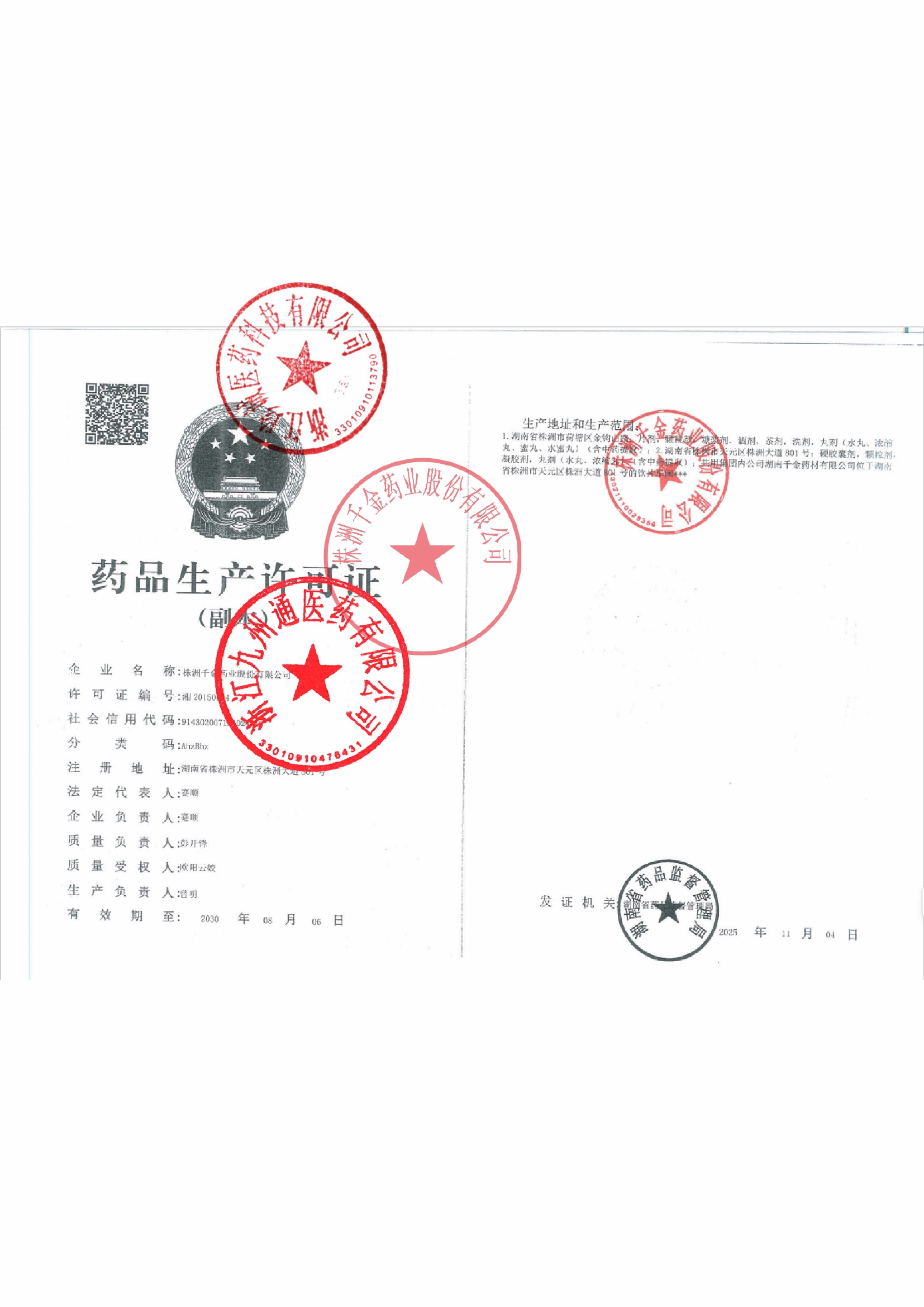 | 1 | Z99004672 | 株洲千金药业股份有限公司 | 许可证.jpg | Jan 6, 2026 2:52:42 PM | 查看下载 | |