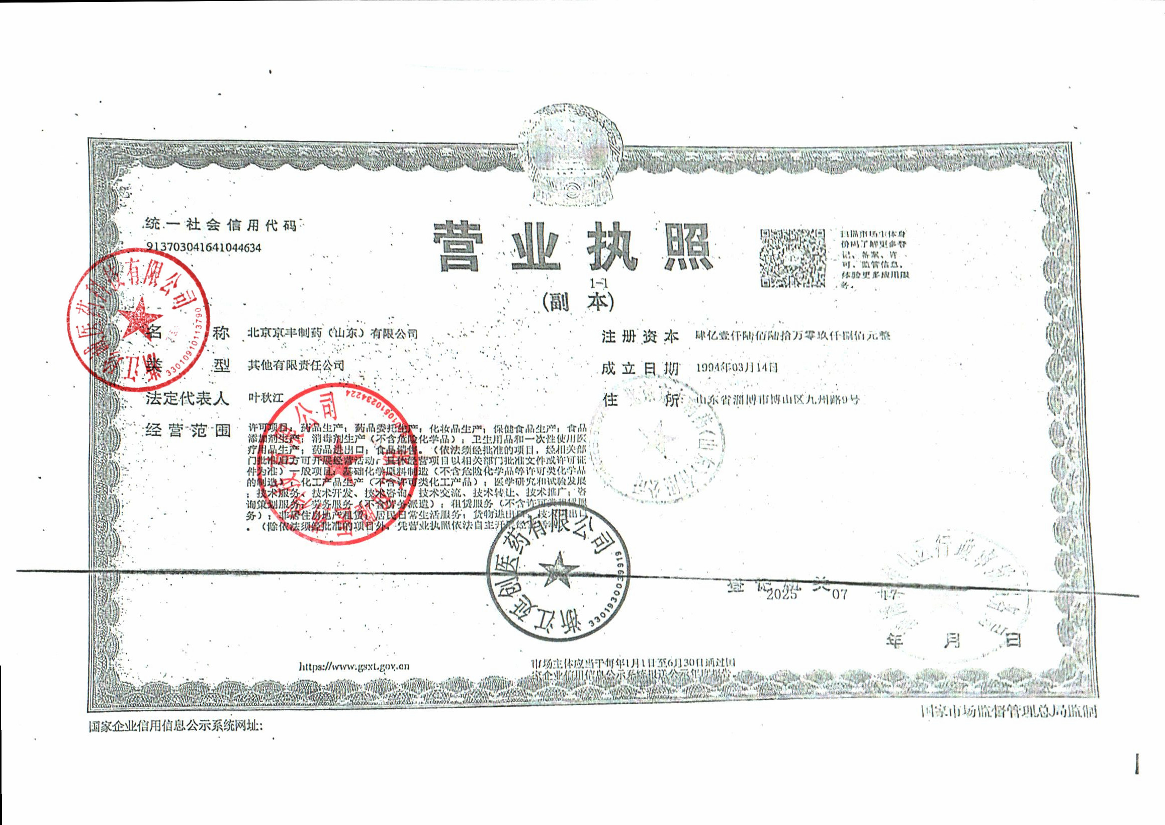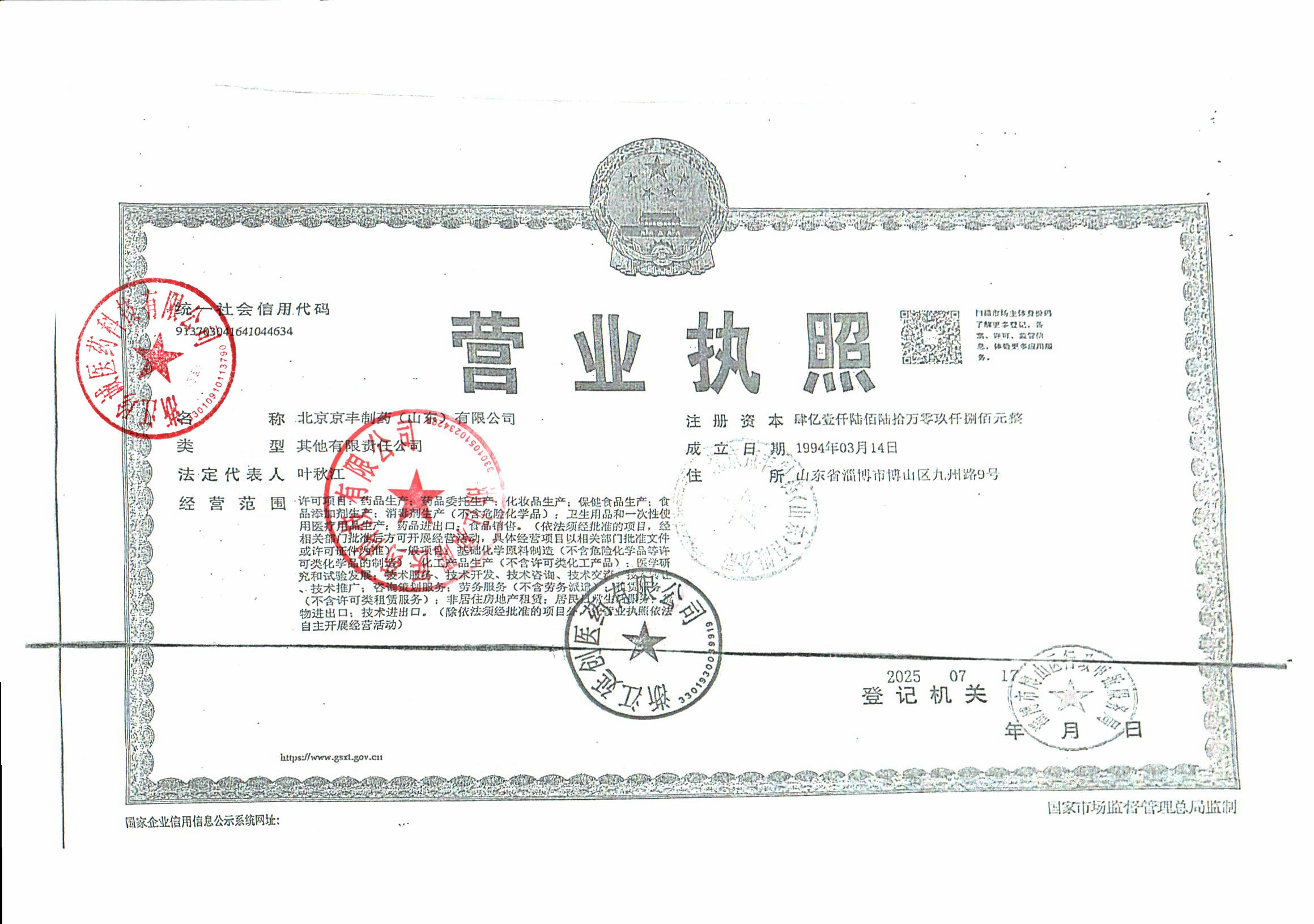 | 7 | Z99009300 | 北京京丰制药(山东)有限公司 | 营业执照 (1).jpg | Jan 22, 2026 2:48:43 PM | 查看下载 | |