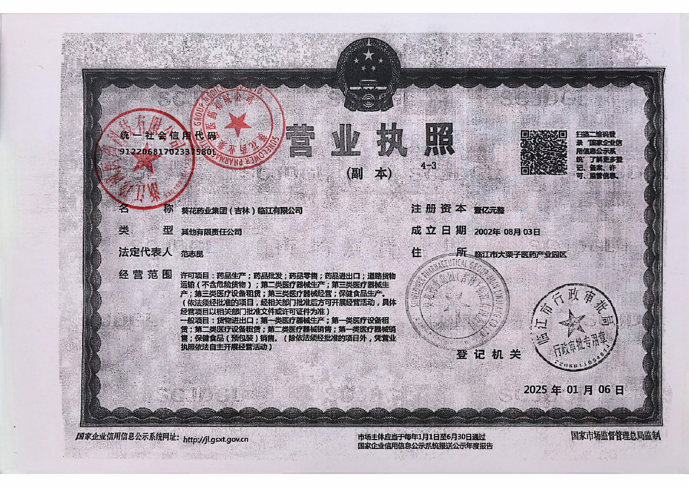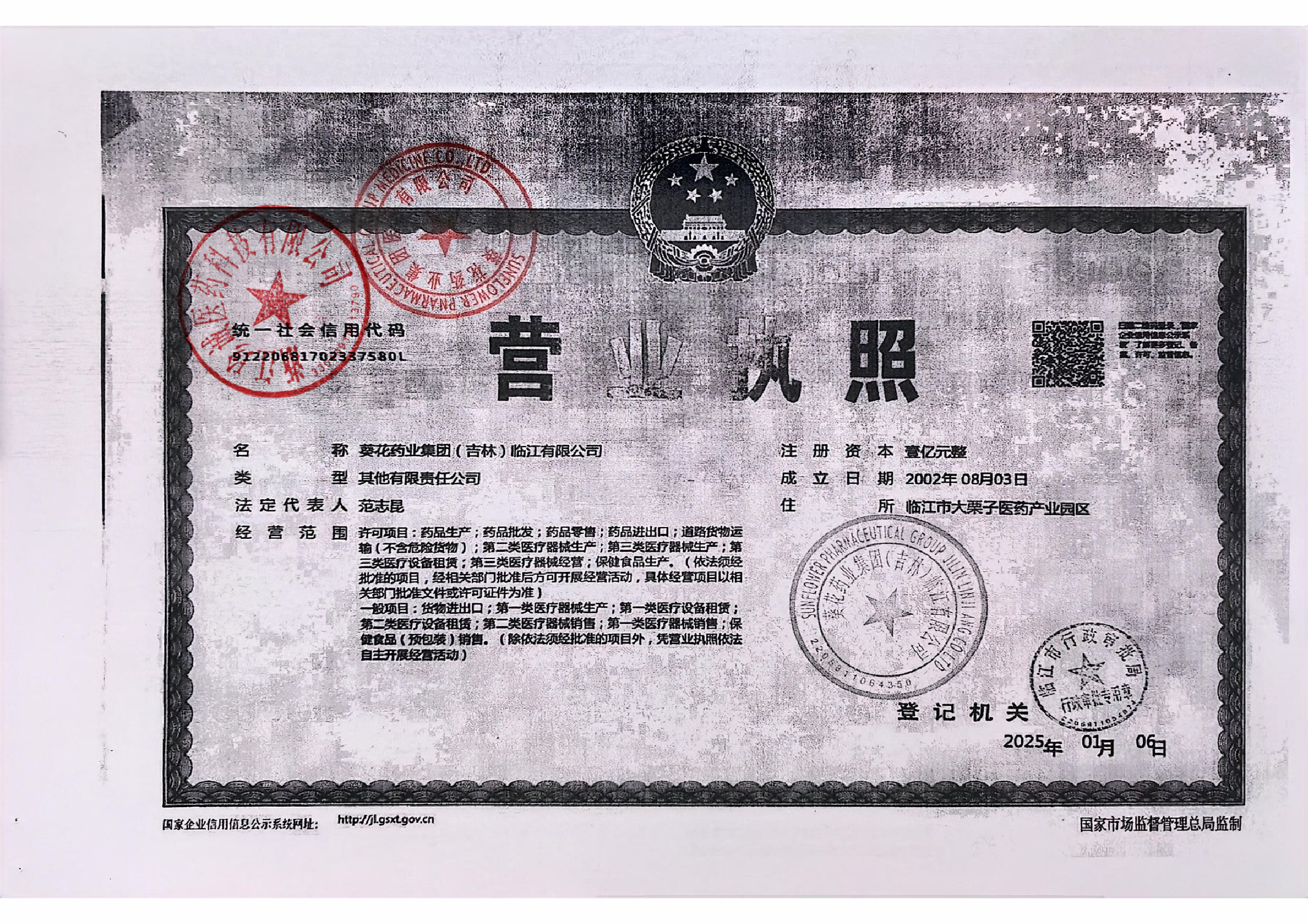 | 1 | Z99010840 | 葵花药业集团(吉林)临江有限公司 | 营业执照1.jpg | Apr 8, 2026 3:43:33 PM | 查看下载 | |