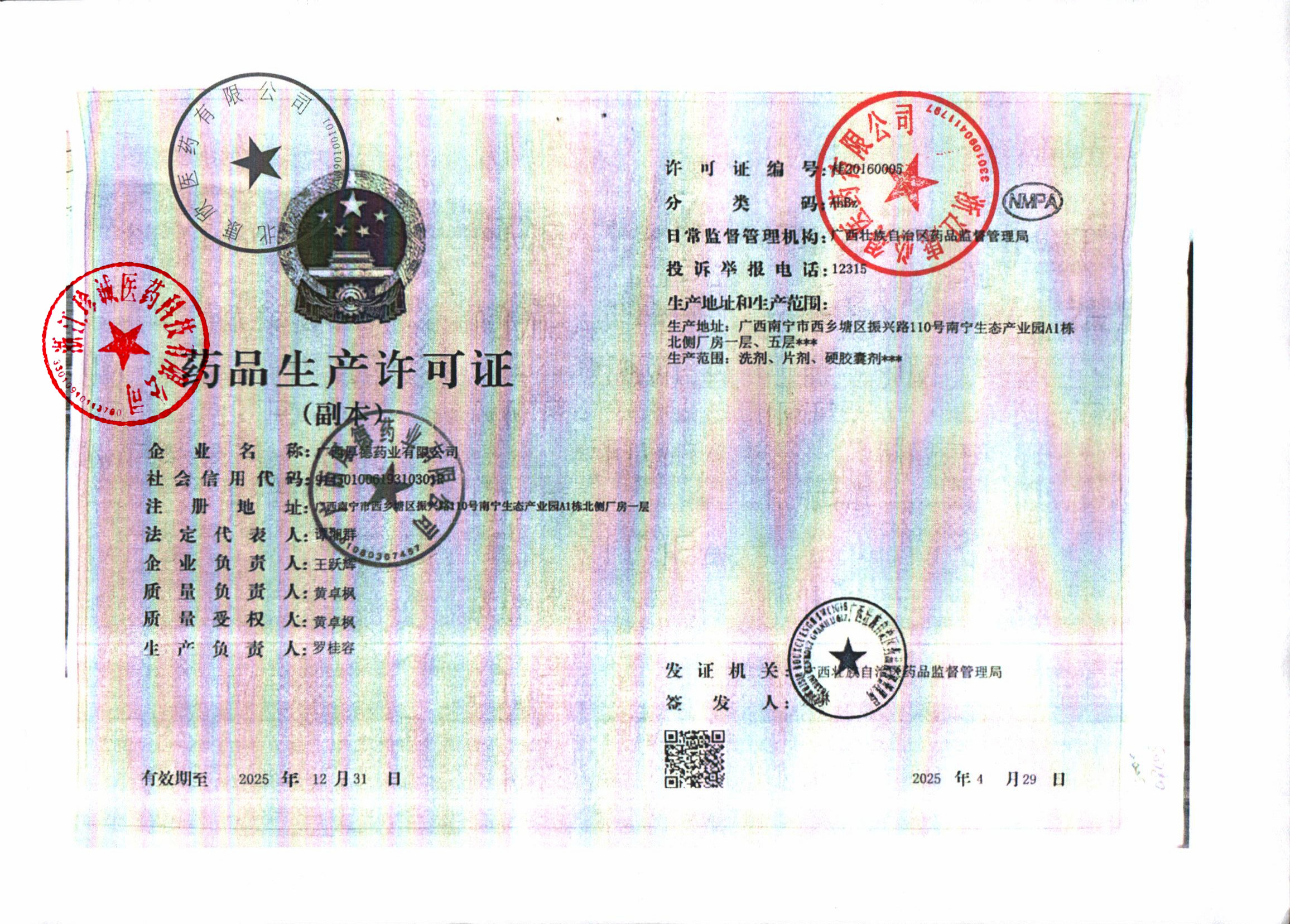 1 | Z99011500 | 广西厚德药业有限公司 | 药品生产许可证.jpg | Sep 17, 2025 1:39:11 PM | 查看下载 | |