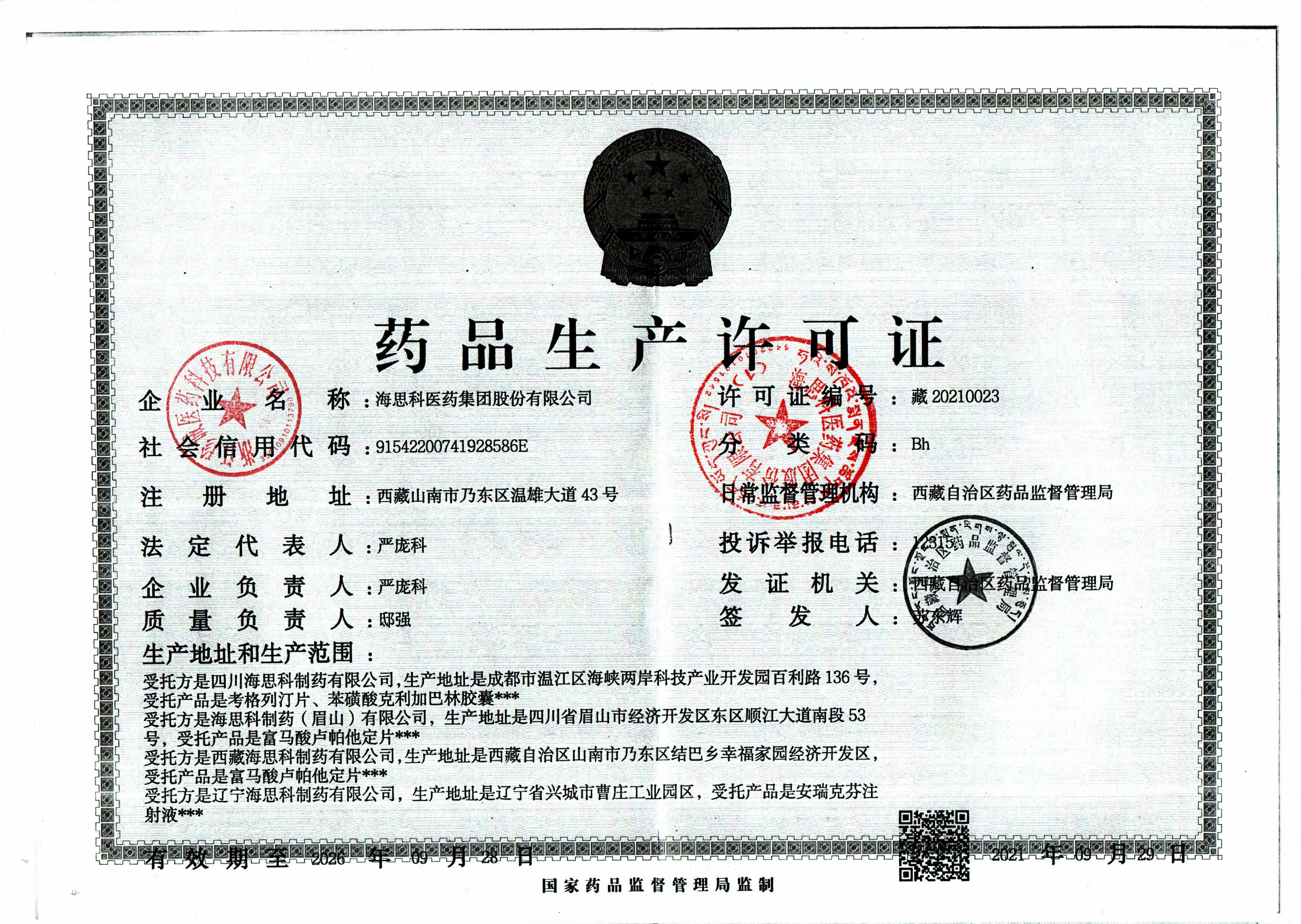 | 1 | Z99012700 | 海思科医药集团股份有限公司 | 许可证.jpg | Mar 3, 2026 9:16:30 AM | 查看下载 | |