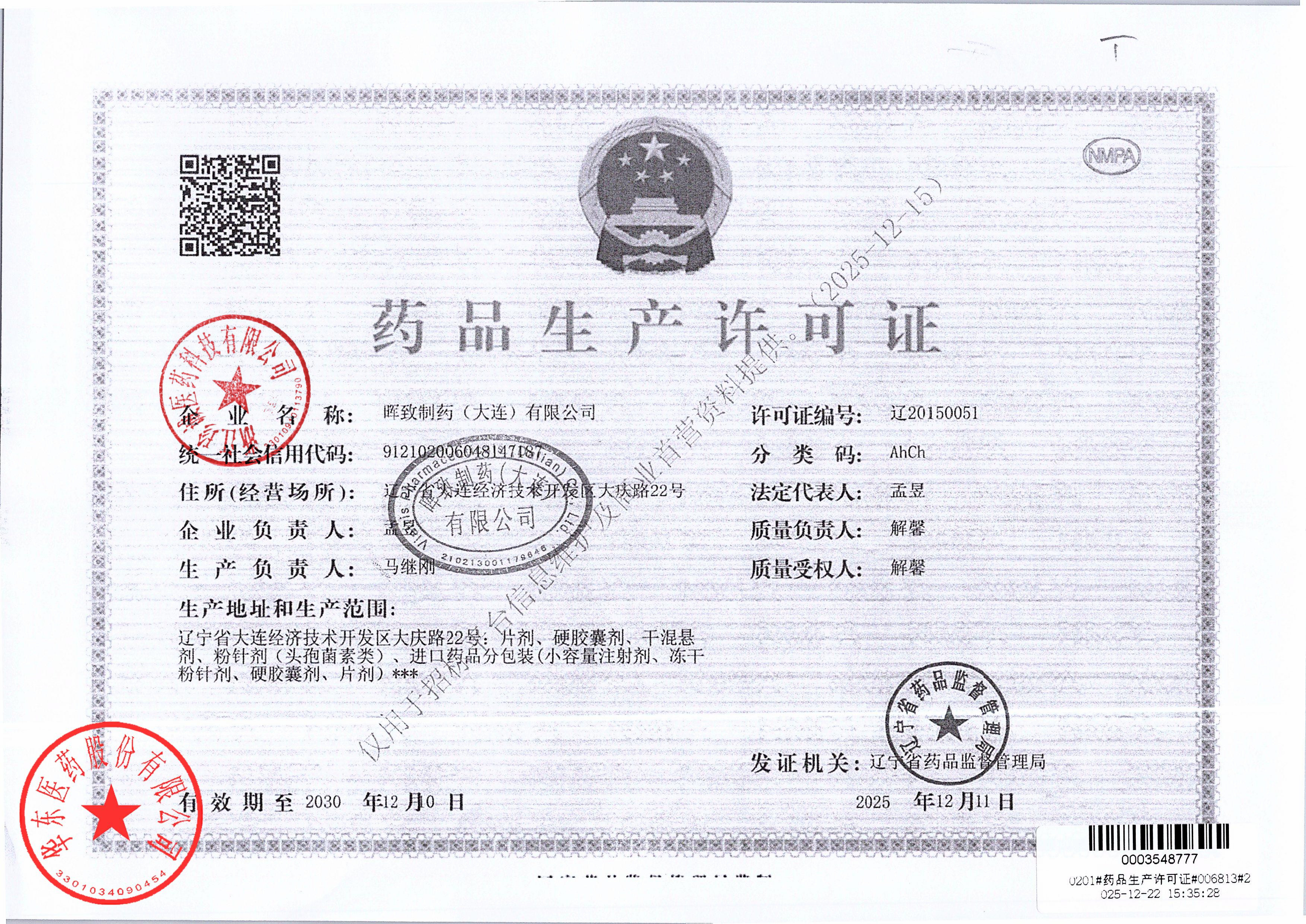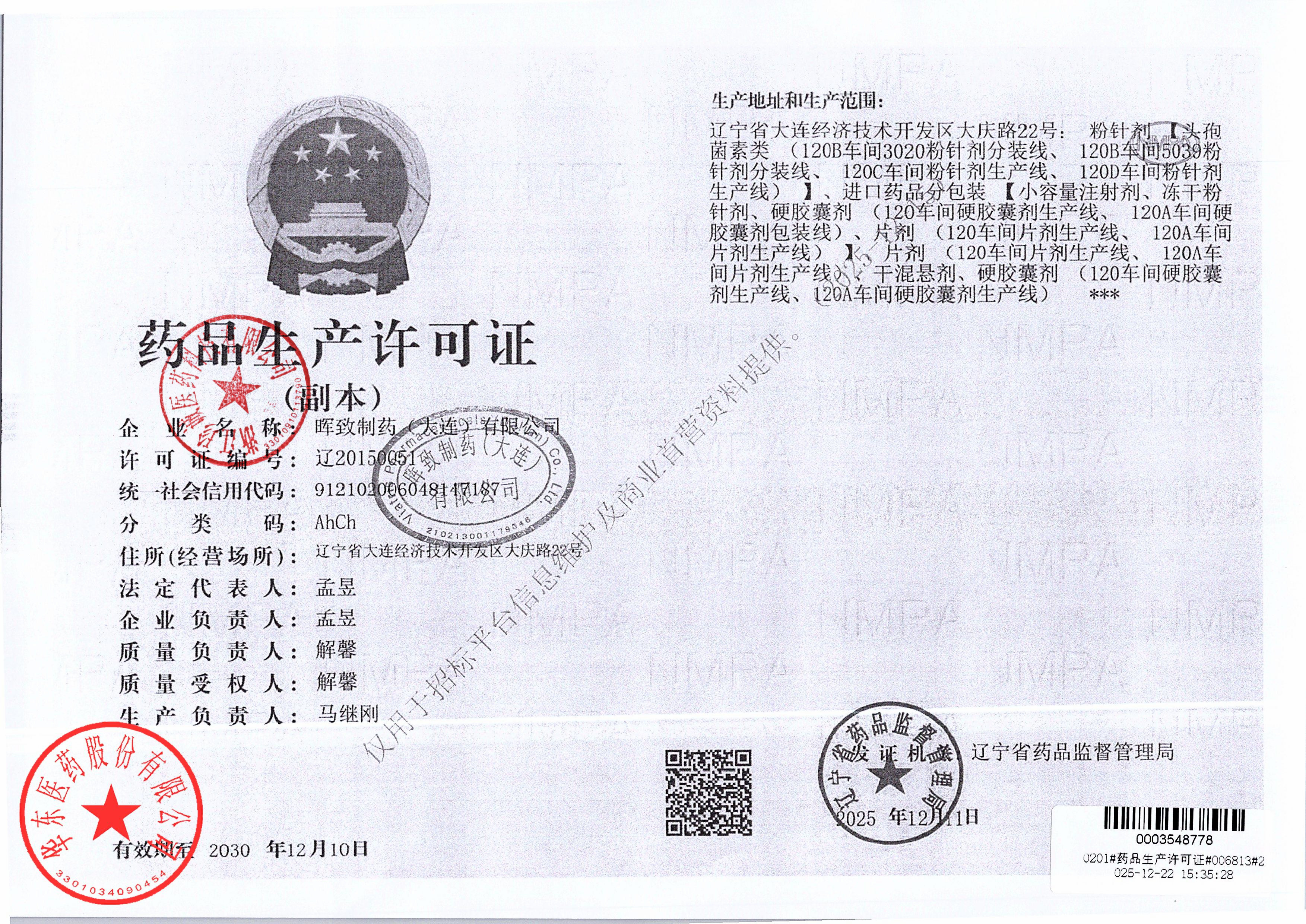 | 6 | Z99014000 | 晖致制药(大连)有限公司 | 营业执照 (1).jpg | Mar 6, 2025 10:06:44 AM | 查看下载 |