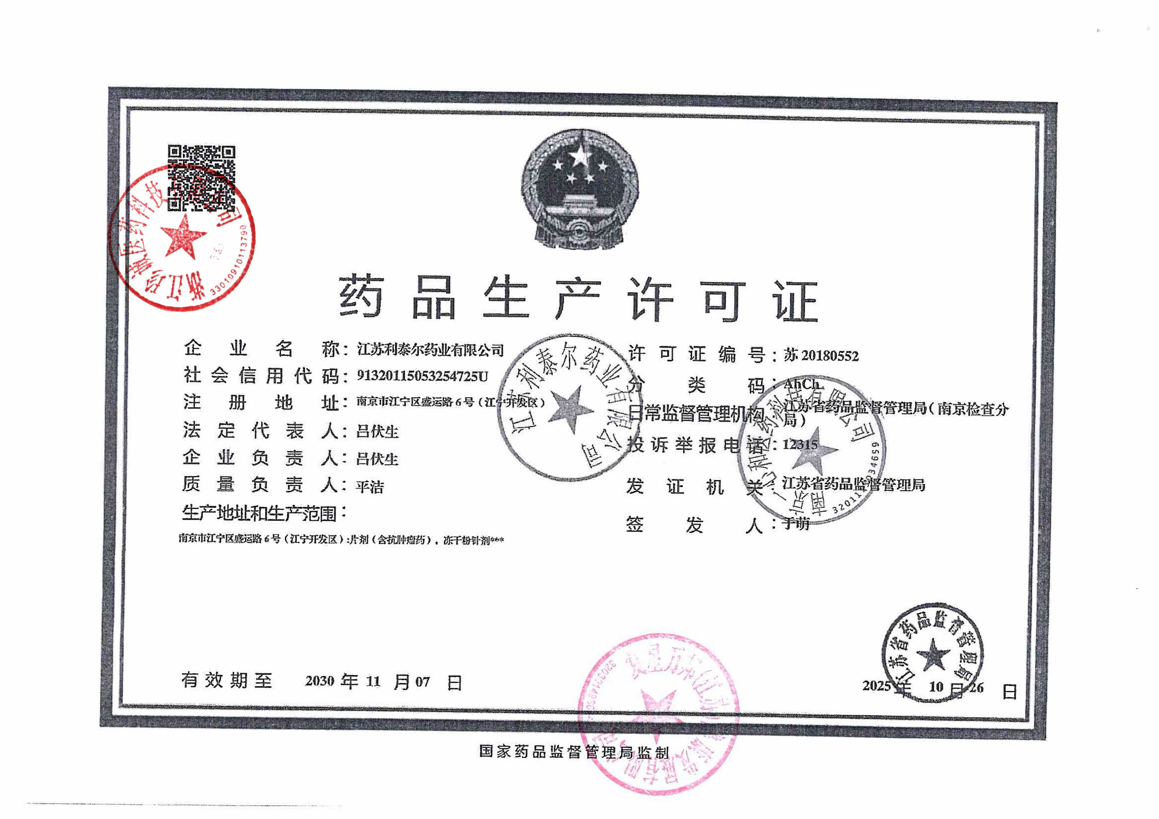 | 2 | Z99014280 | 江苏利泰尔药业有限公司 | 许可证 (1).jpg | Jan 29, 2026 3:28:09 PM | 查看下载 | |