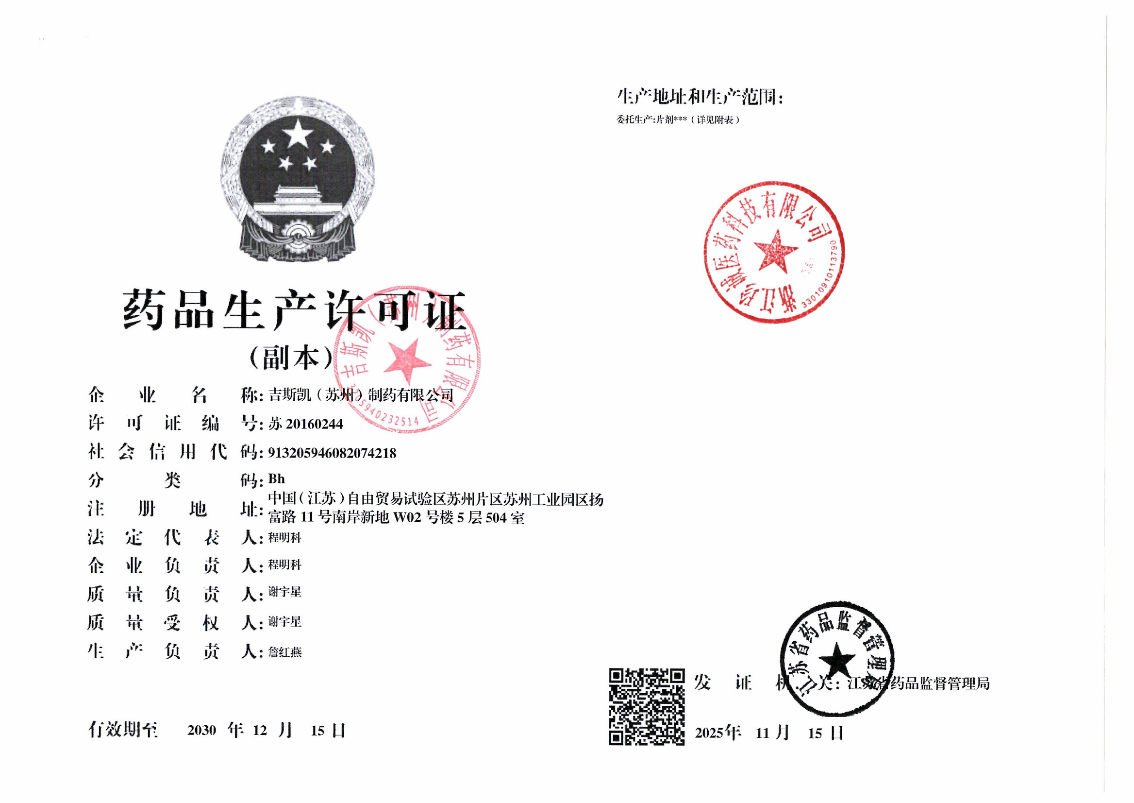 | 3 | Z99014642 | 吉斯凯(苏州)制药有限公司 | 许可证 (2).jpg | Mar 19, 2026 4:35:22 PM | 查看下载 | |