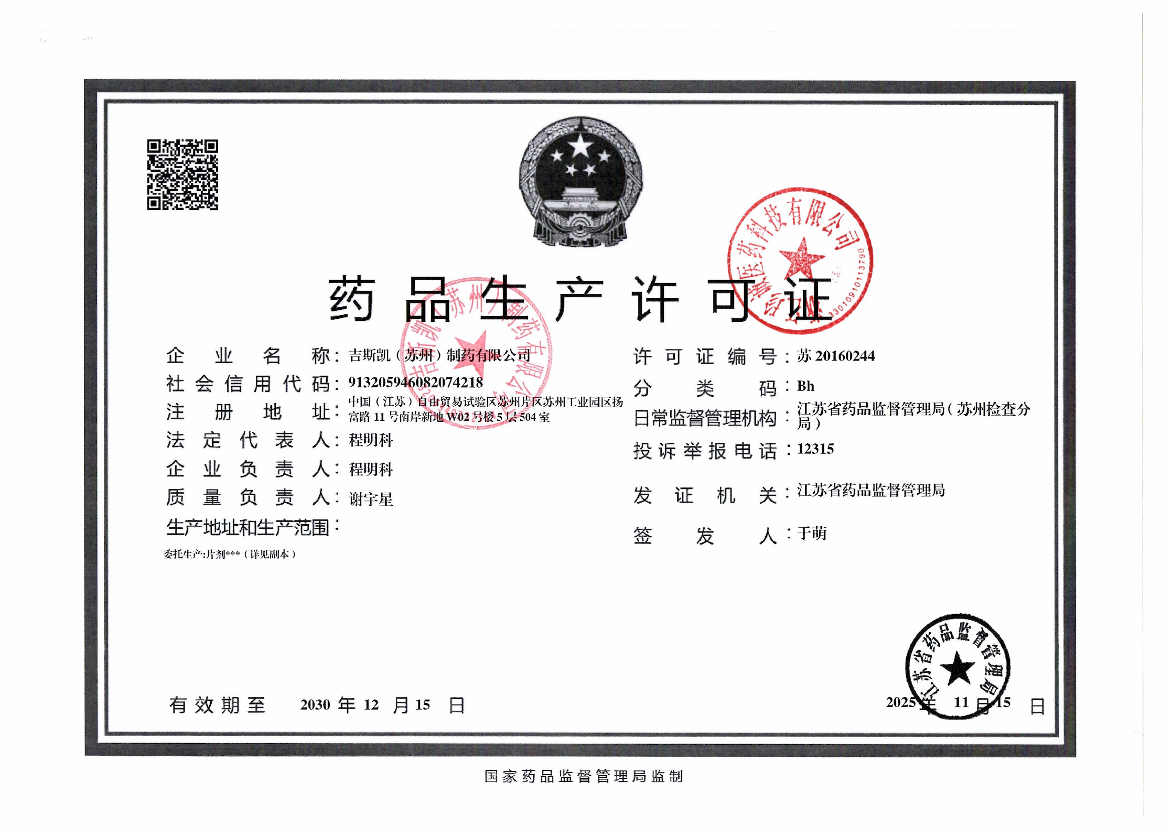 | 4 | Z99014642 | 吉斯凯(苏州)制药有限公司 | 许可证 (1).jpg | Mar 19, 2026 4:35:22 PM | 查看下载 | |