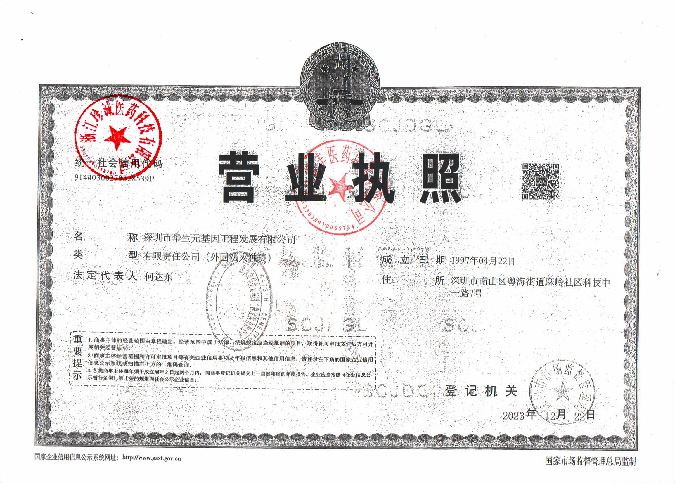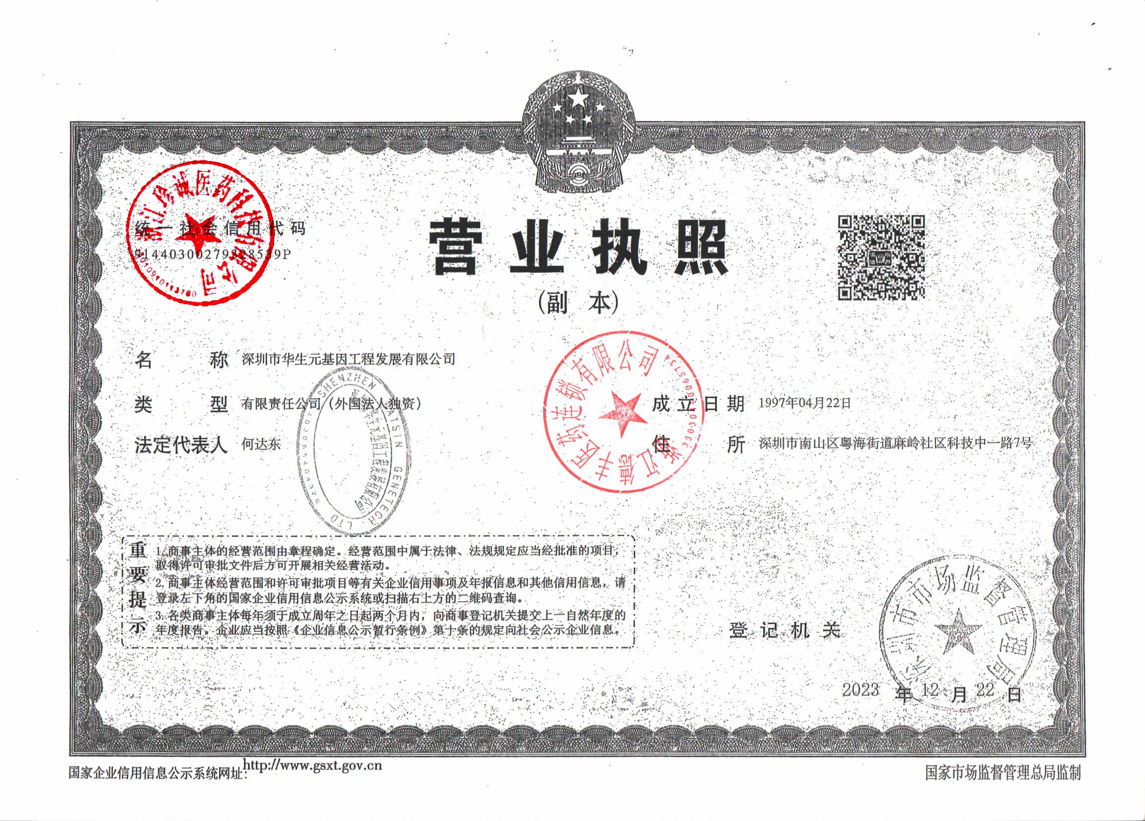 | 7 | Z99014700 | 深圳市华生元基因工程发展有限公司 | 营业执照.jpg | Aug 14, 2025 2:09:31 PM | 查看下载 |