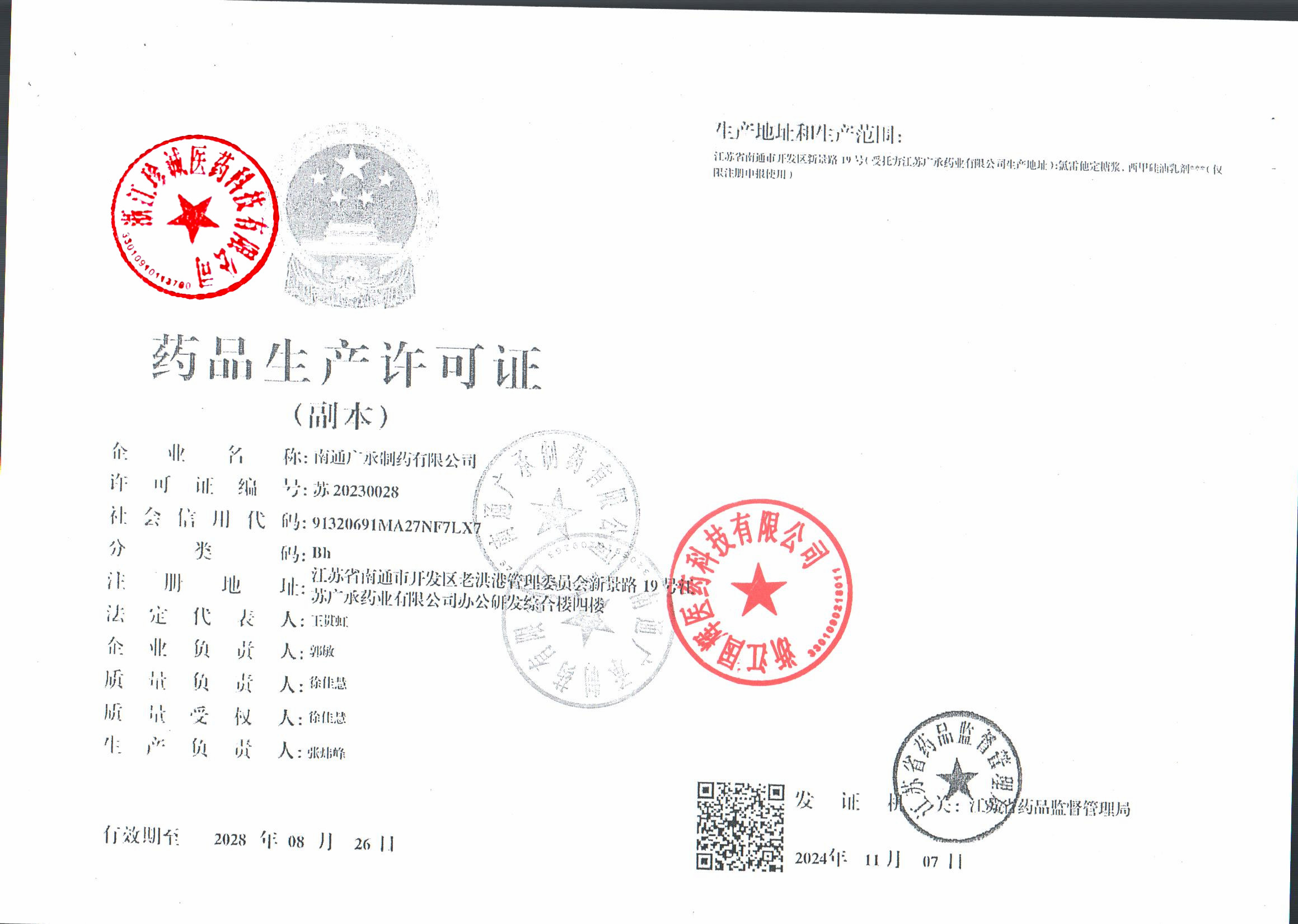| 5 | Z99014720 | 南通广承制药有限公司 | 药品生产许可证副本.jpg | Aug 19, 2025 10:51:25 AM | 查看下载 | |
