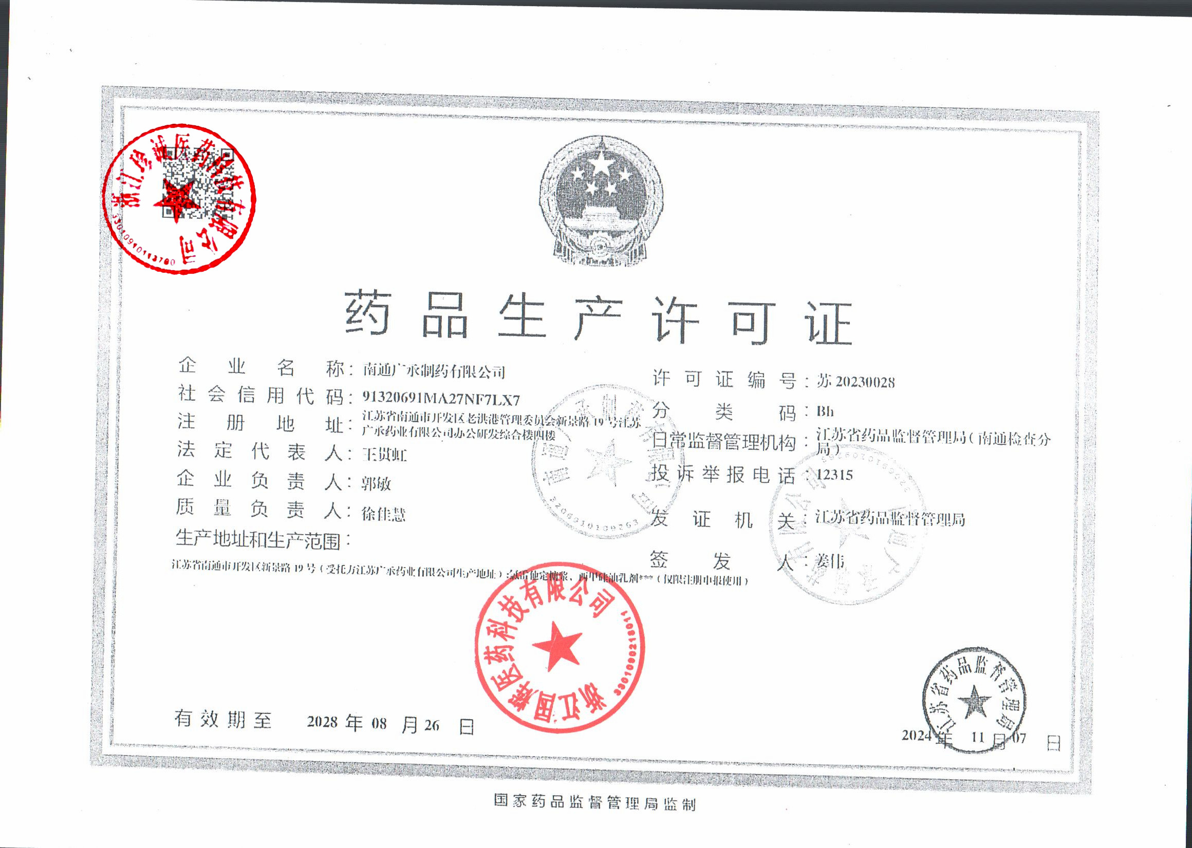 | 1 | Z99014720 | 南通广承制药有限公司 | 药品生产许可证.jpg | Aug 19, 2025 10:51:25 AM | 查看下载 | |