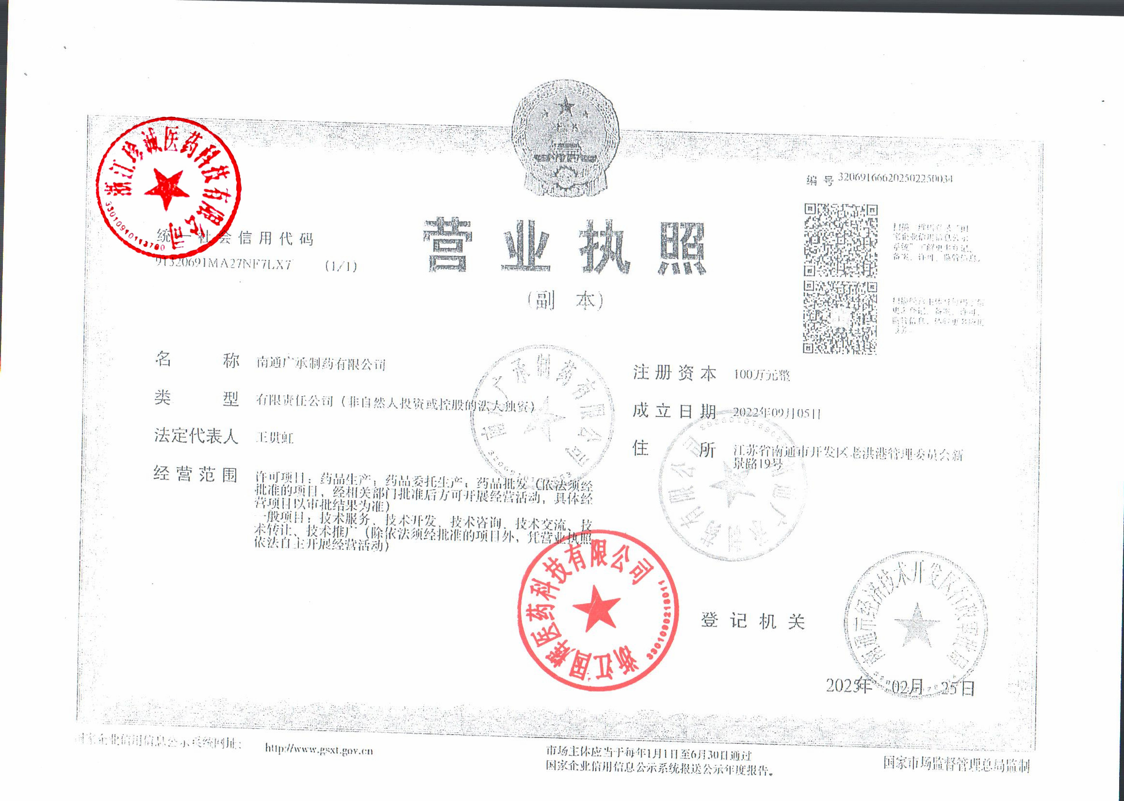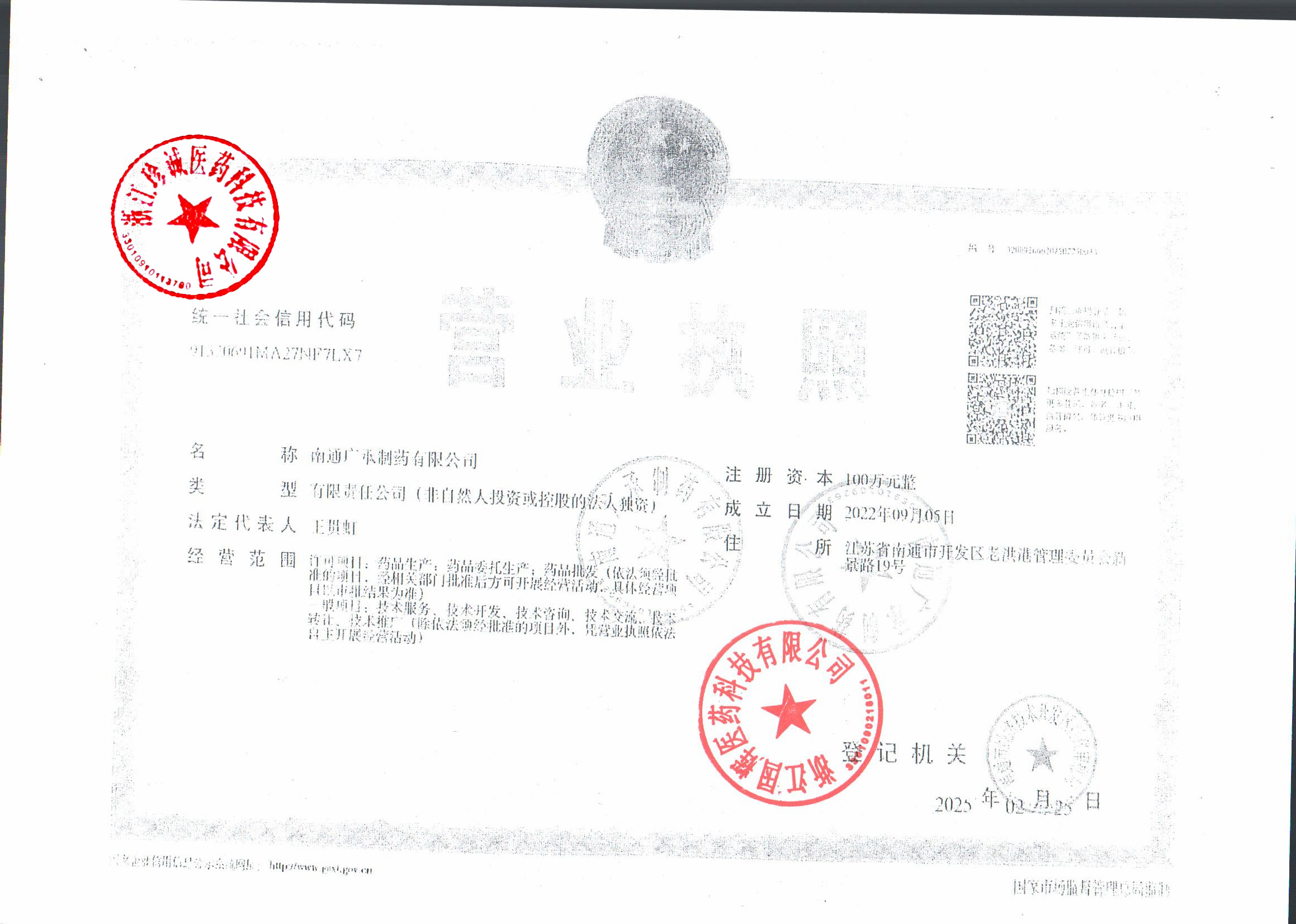 | 2 | Z99014720 | 南通广承制药有限公司 | 营业执照 (2).jpg | Aug 19, 2025 10:51:25 AM | 查看下载 | |