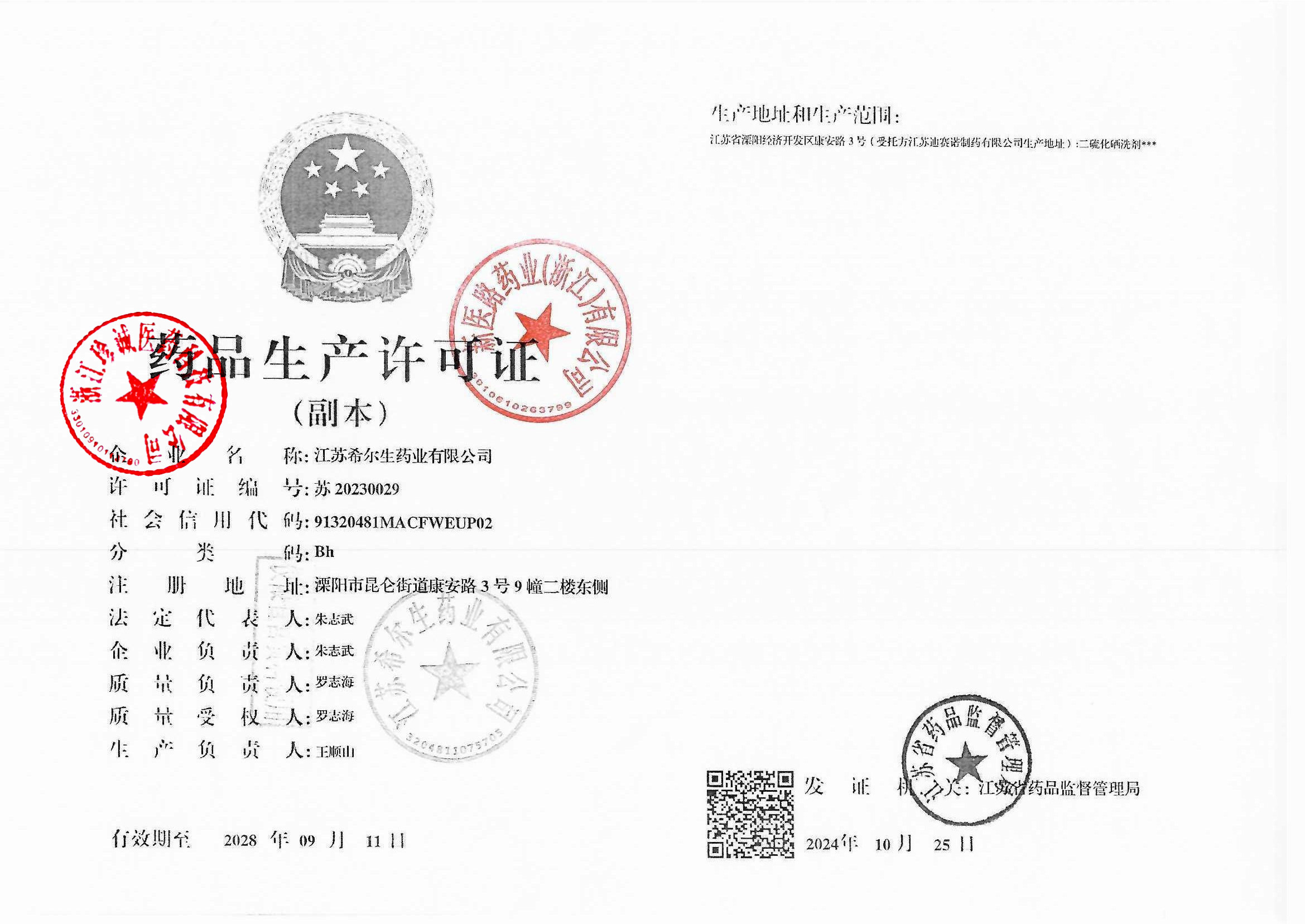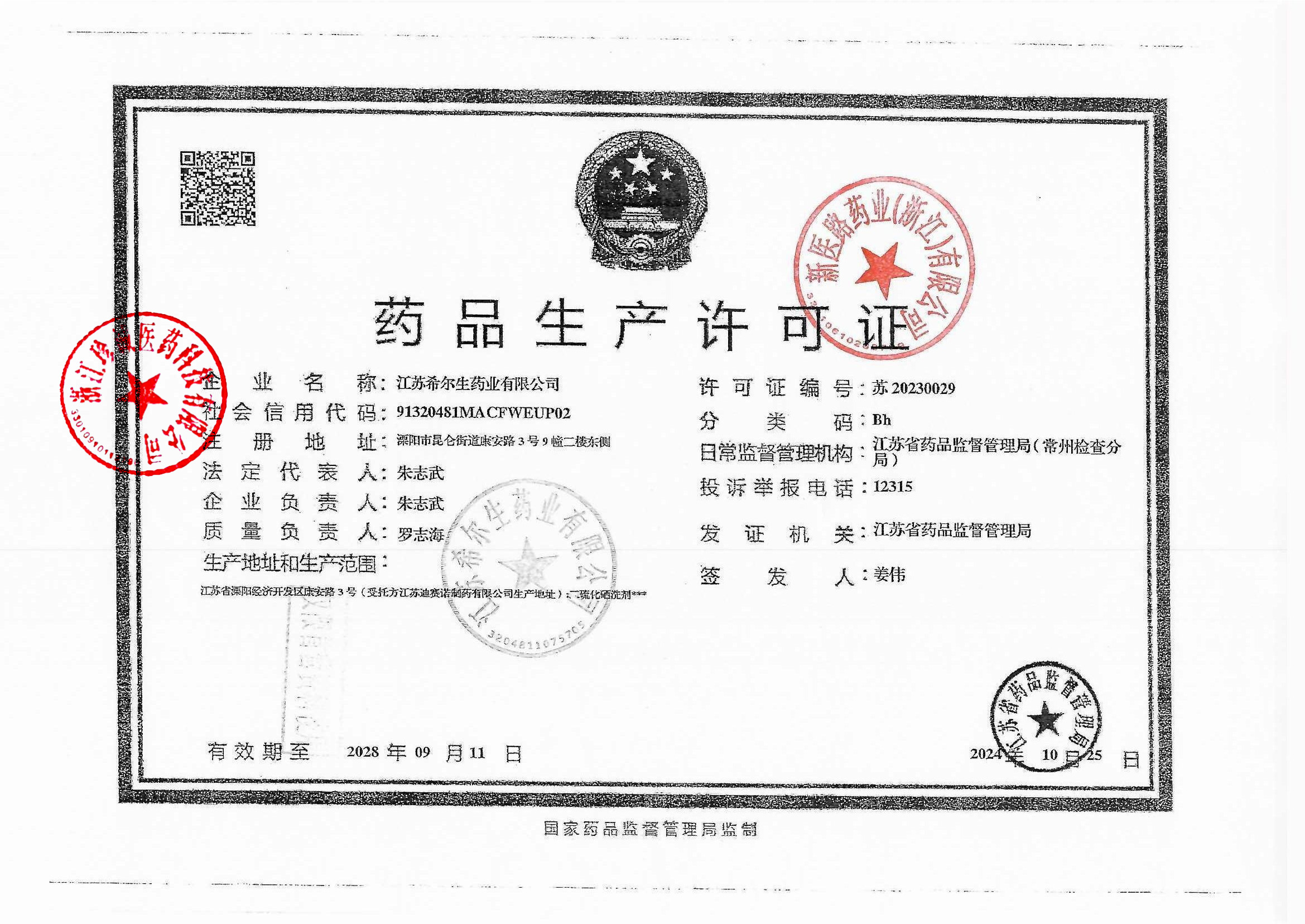 4 | Z99014884 | 江苏希尔生物药业有限公司 | 生产许可证 (2).jpg | Sep 22, 2025 1:11:39 PM | 查看下载 | |