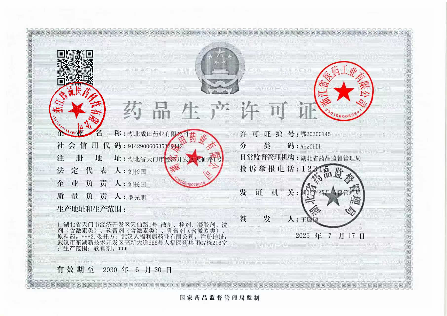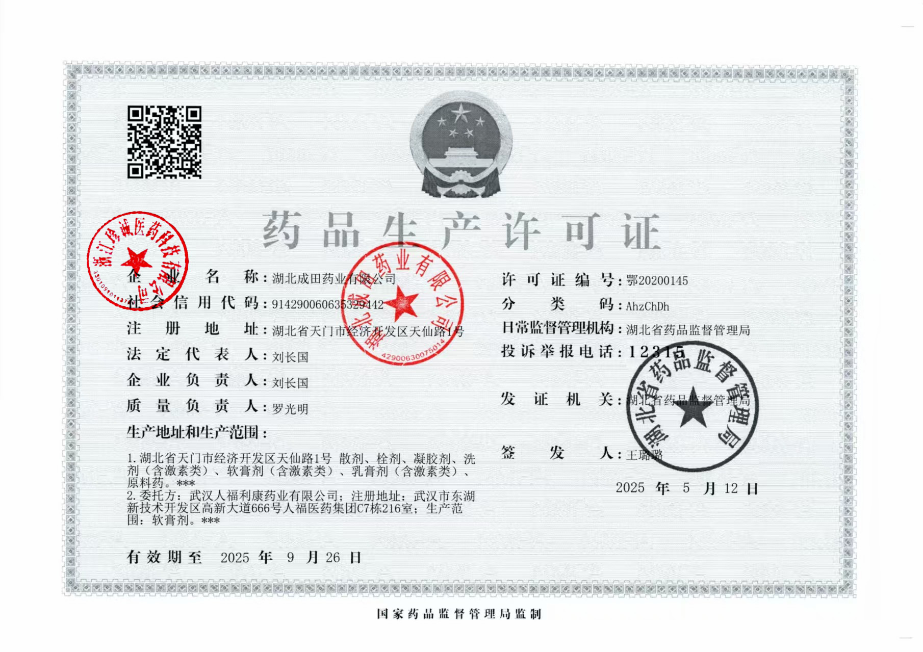 | 1 | Z99014904 | 湖北成田药业有限公司 | 新药品生产许可证.jpg | Sep 29, 2025 9:12:56 AM | 查看下载 | |