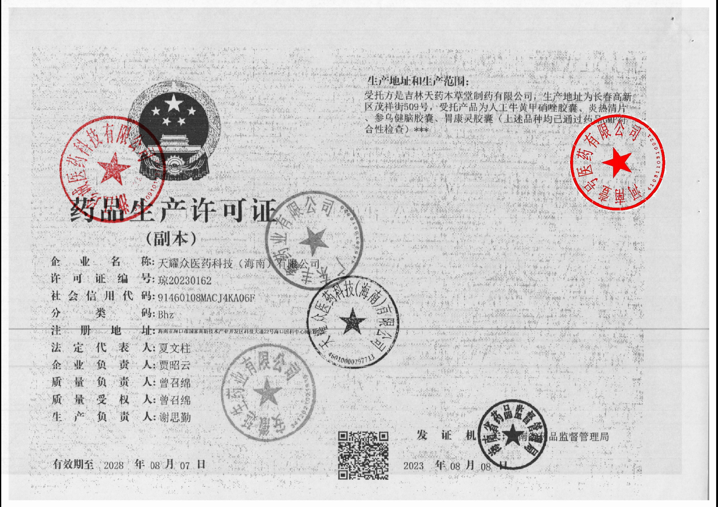 4 Z99014980 天耀众医药科技(海南)有限公司 药品生产许可证 (2).jpg Oct 17, 2025 11:03:52 AM 查看下载