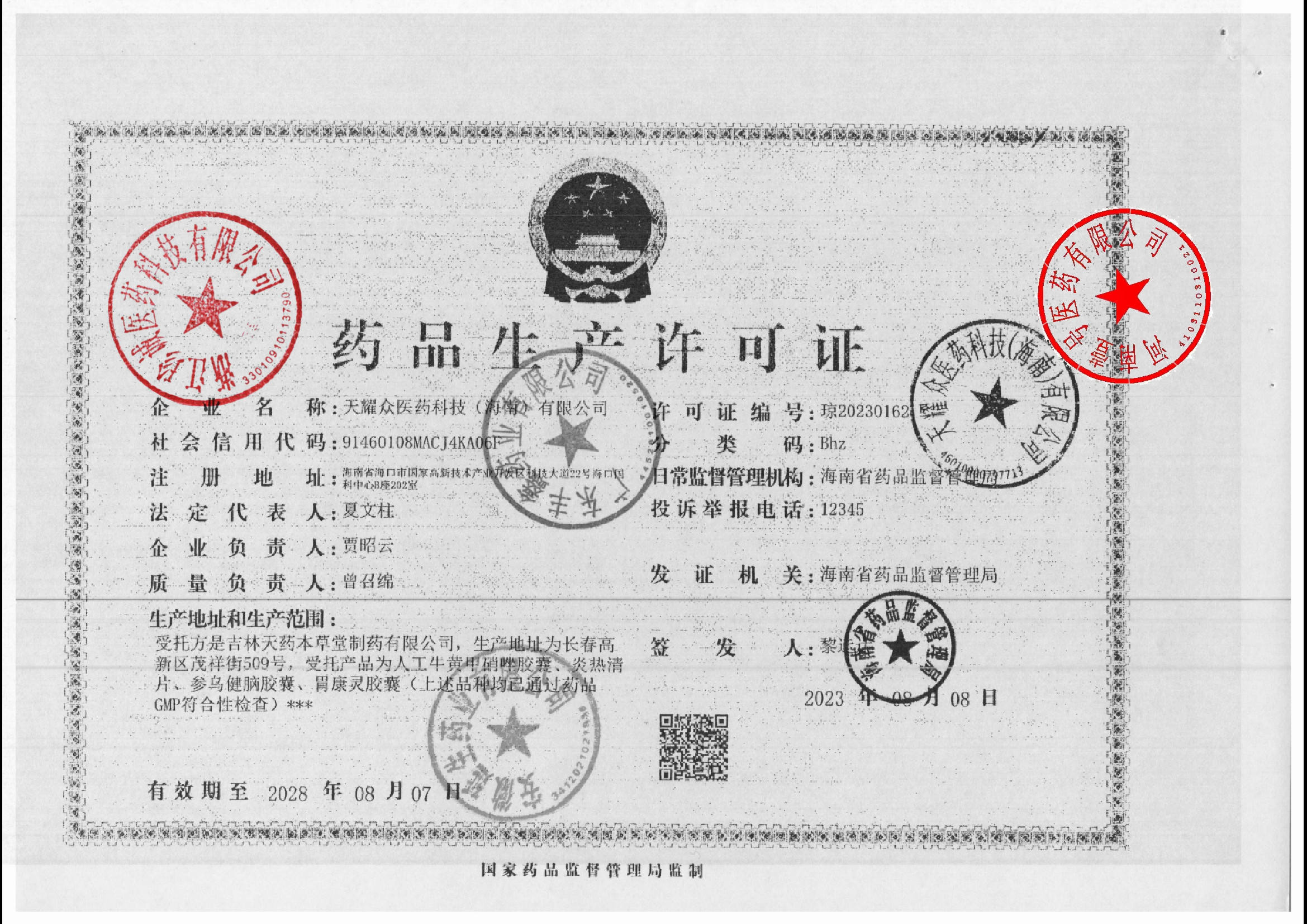 3 Z99014980 天耀众医药科技(海南)有限公司 药品生产许可证 (1).jpg Oct 17, 2025 11:03:52 AM 查看下载