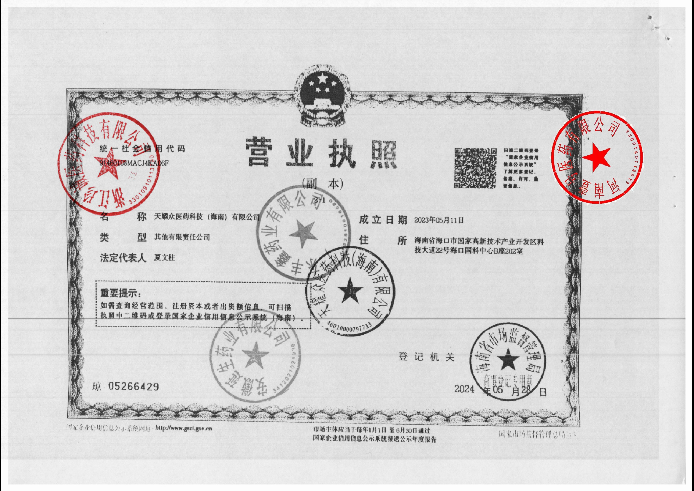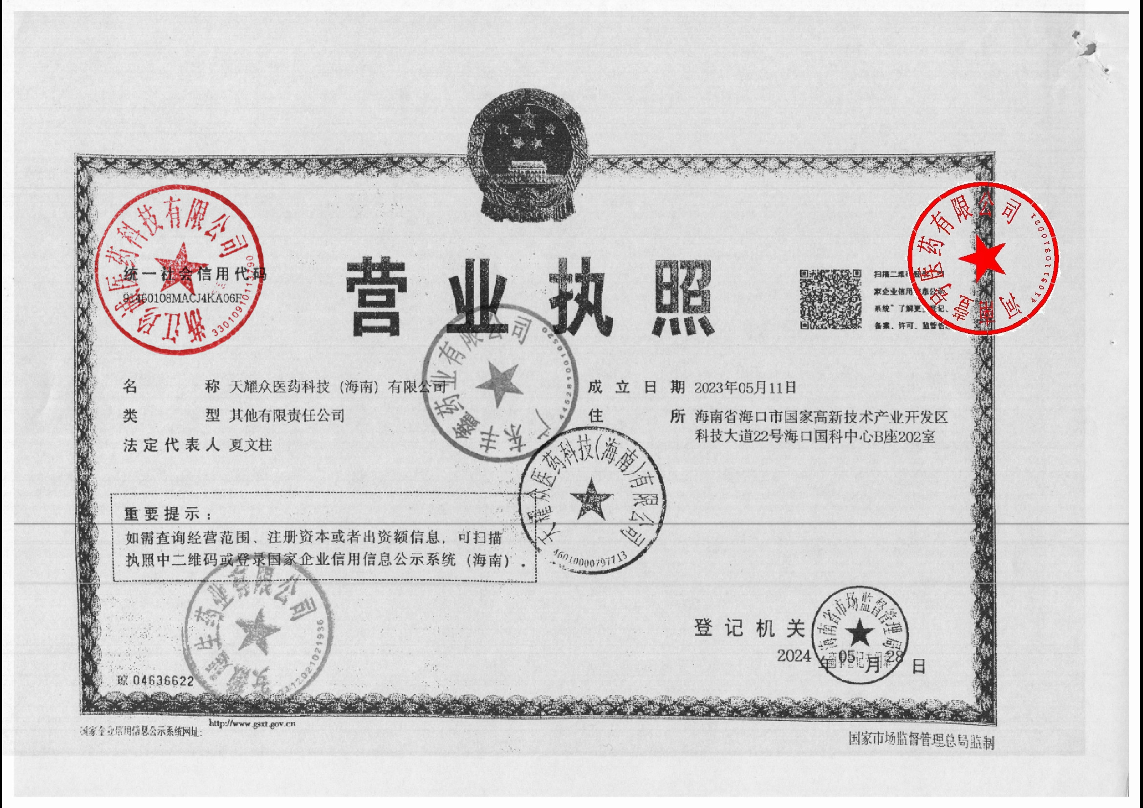 5 Z99014980 天耀众医药科技(海南)有限公司 营业执照 (2).jpg Oct 17, 2025 11:03:52 AM 查看下载