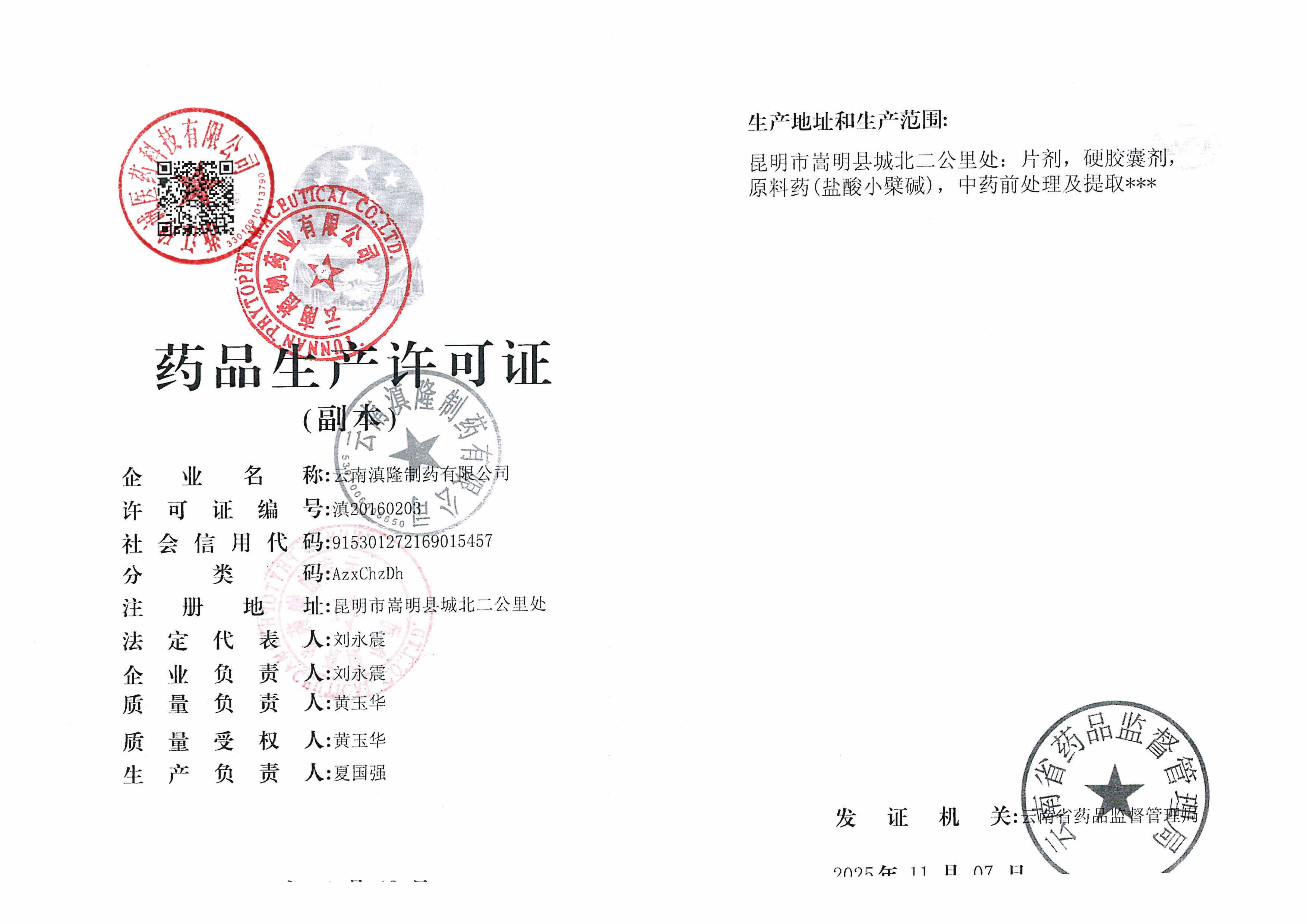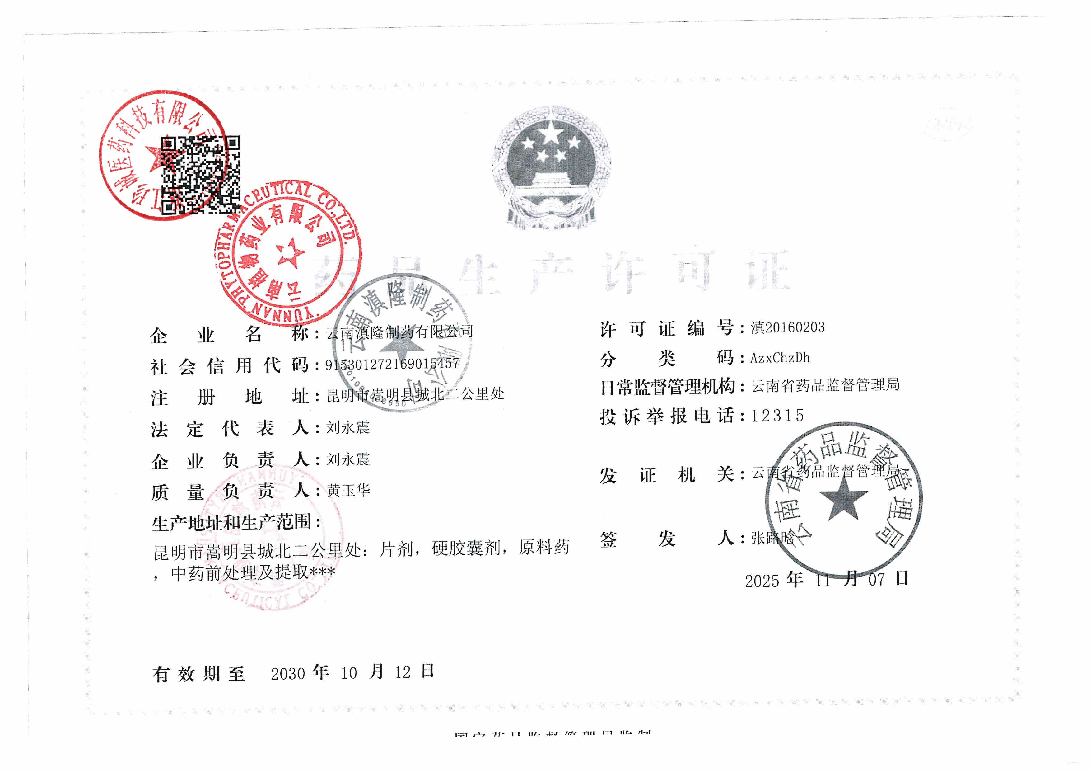 | 7 | Z99015200 | 云南滇隆制药有限公司 | 许可证 (1).jpg | Dec 9, 2025 12:00:00 AM | 查看下载 |