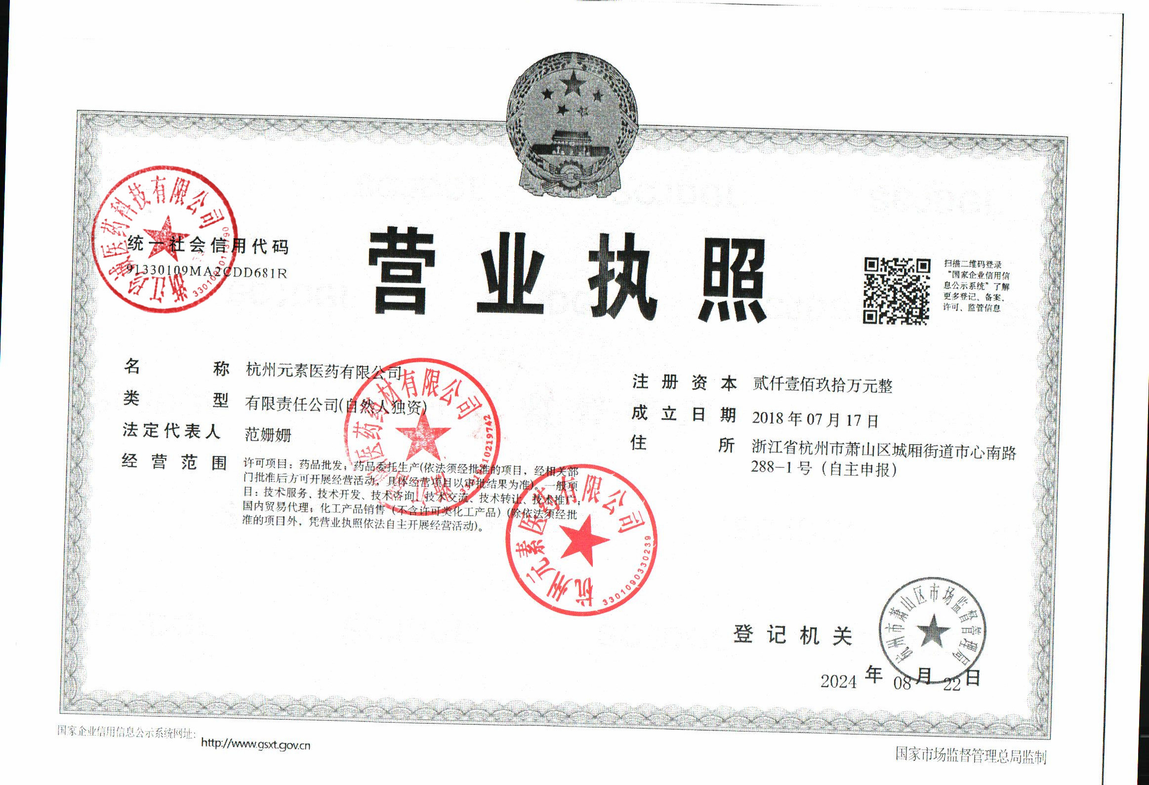 | 2 | Z99015283 | 杭州元素医药有限公司 | 营业执照 (2).jpg | Dec 17, 2025 3:27:27 PM | 查看下载 | |
