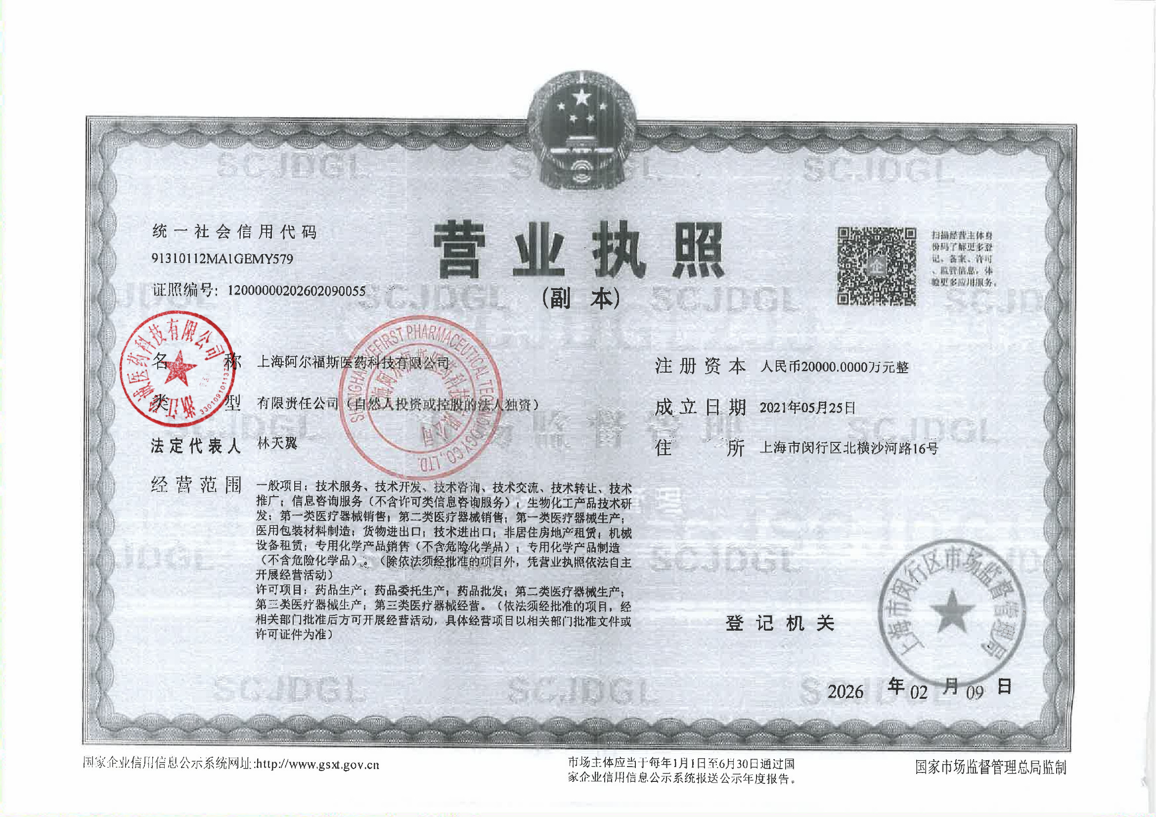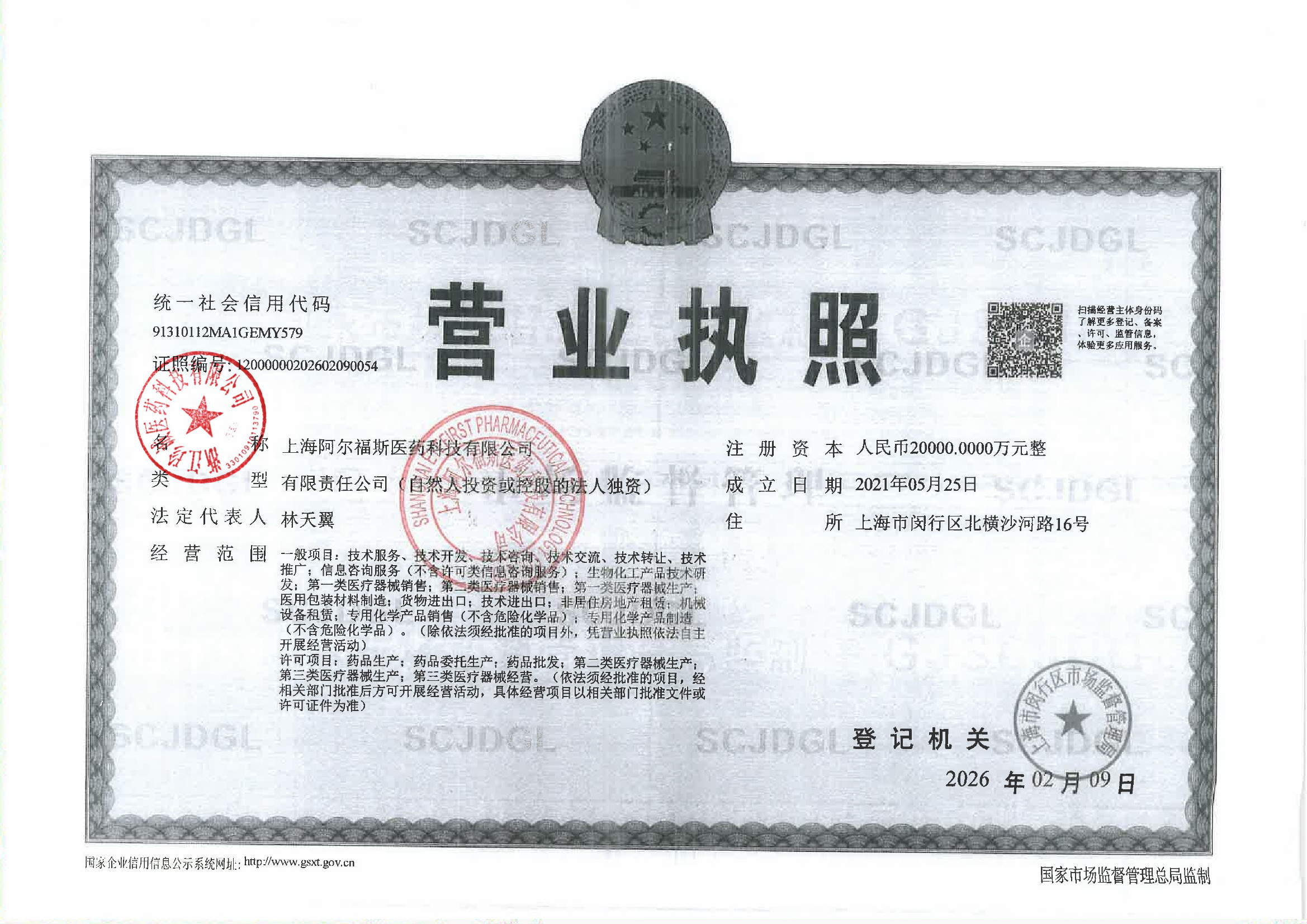 | 2 | Z99015720 | 上海阿尔福斯医药科技有限公司 | 营业执照 (1).jpg | Mar 4, 2026 2:25:33 PM | 查看下载 | |
