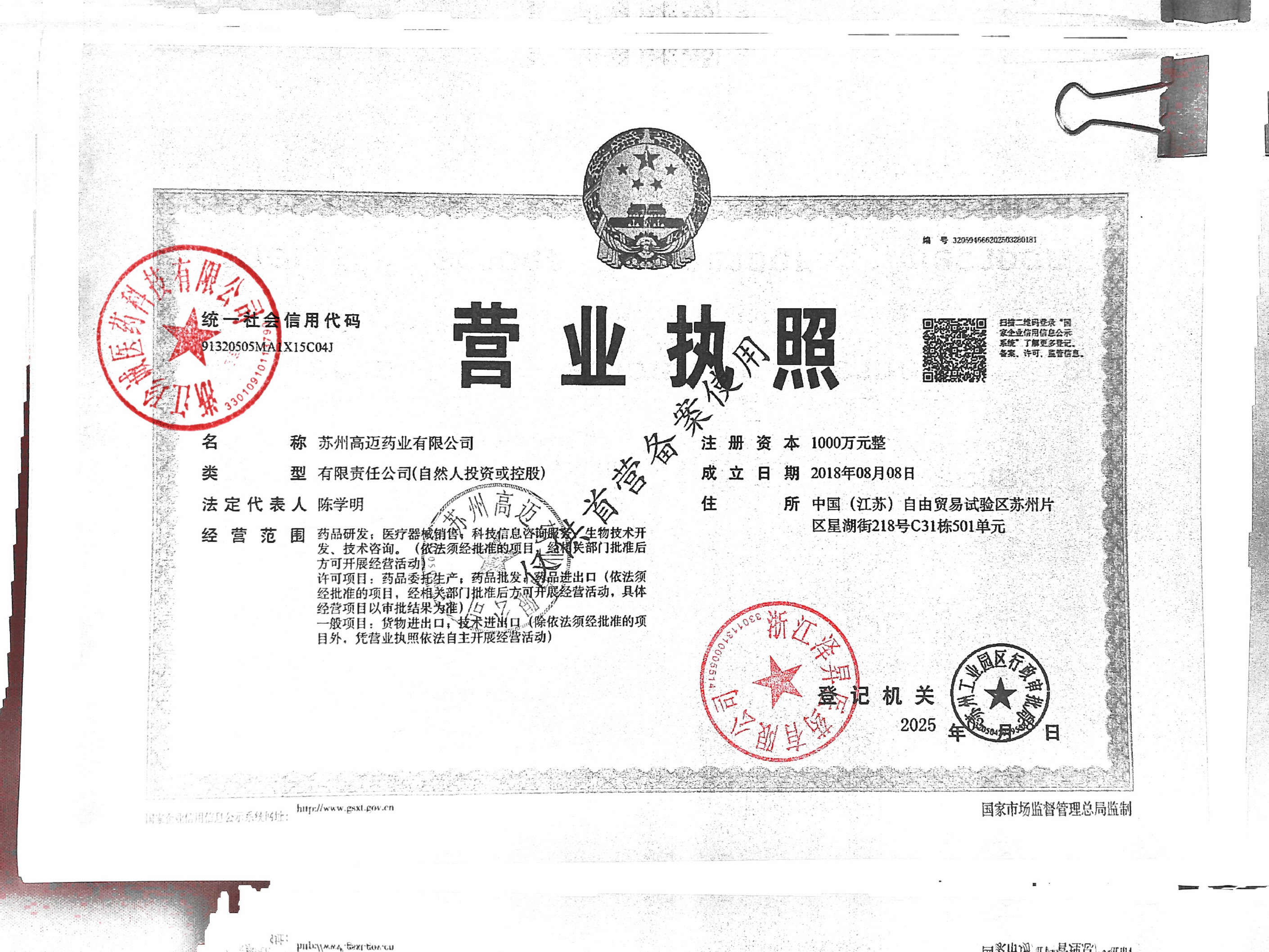 | 2 | Z99015960 | 苏州高迈药业有限公司 | 营业执照.jpg | Apr 3, 2026 8:56:25 AM | 查看下载 | |