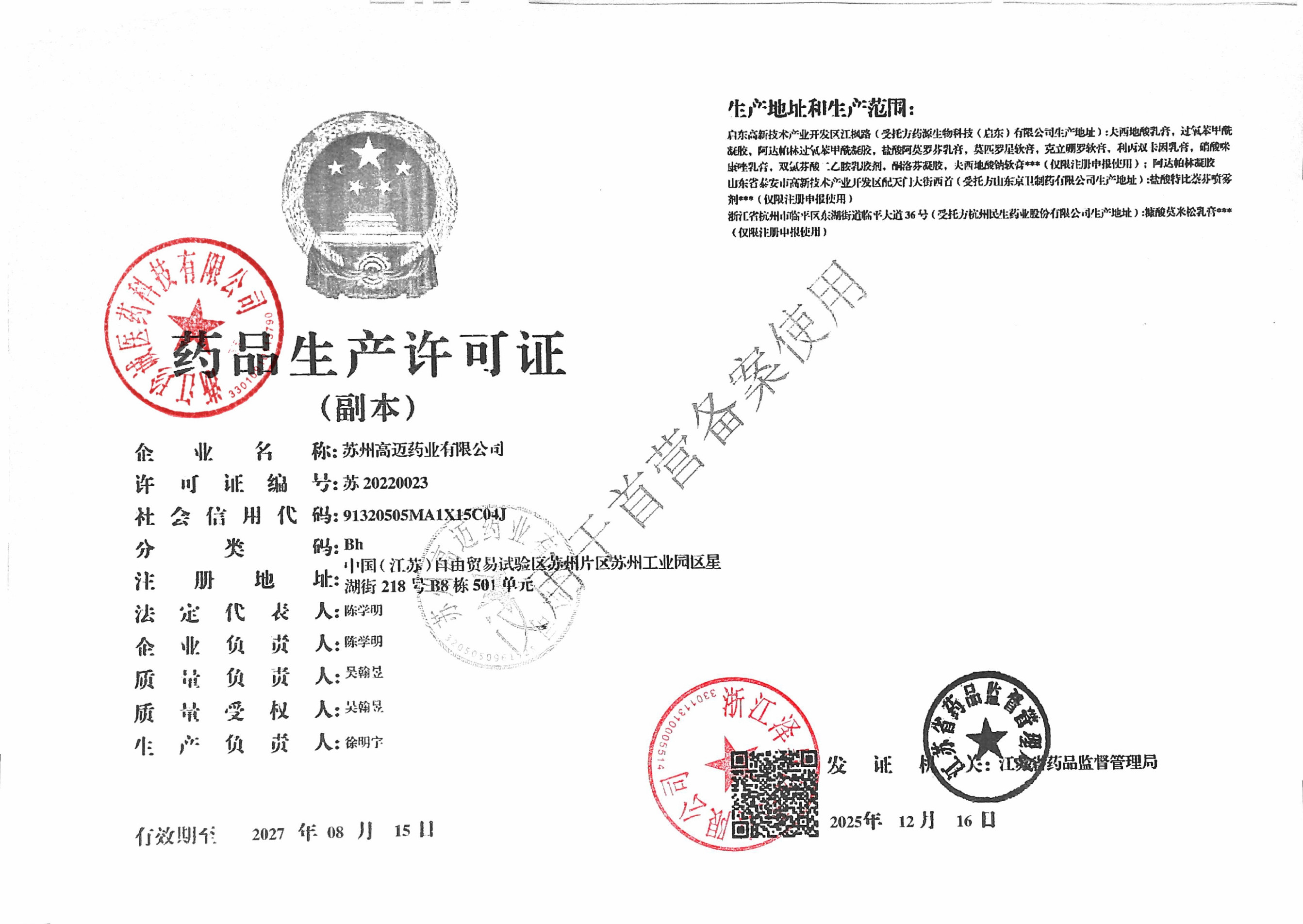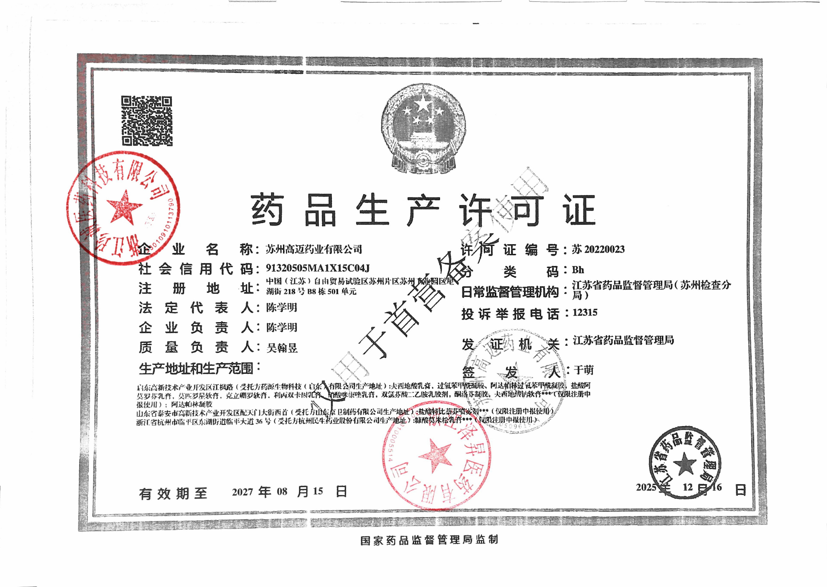 | 1 | Z99015960 | 苏州高迈药业有限公司 | 许可证 (2).jpg | Apr 3, 2026 8:56:25 AM | 查看下载 | |