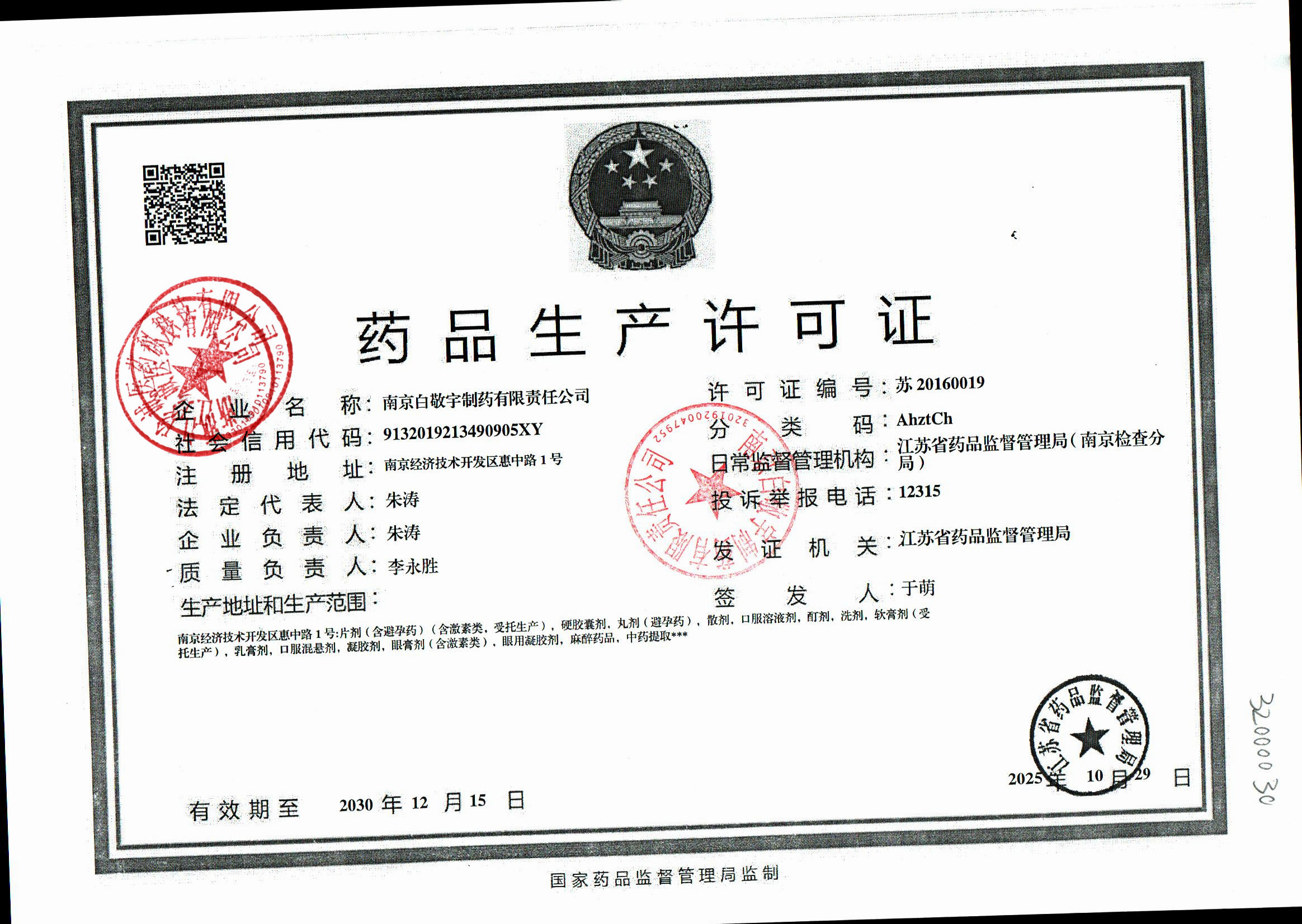 | 1 | 32000030 | 南京白敬宇制药有限责任公司 | 许可证 (1).jpg | Dec 17, 2025 10:11:54 AM | 查看下载 | |