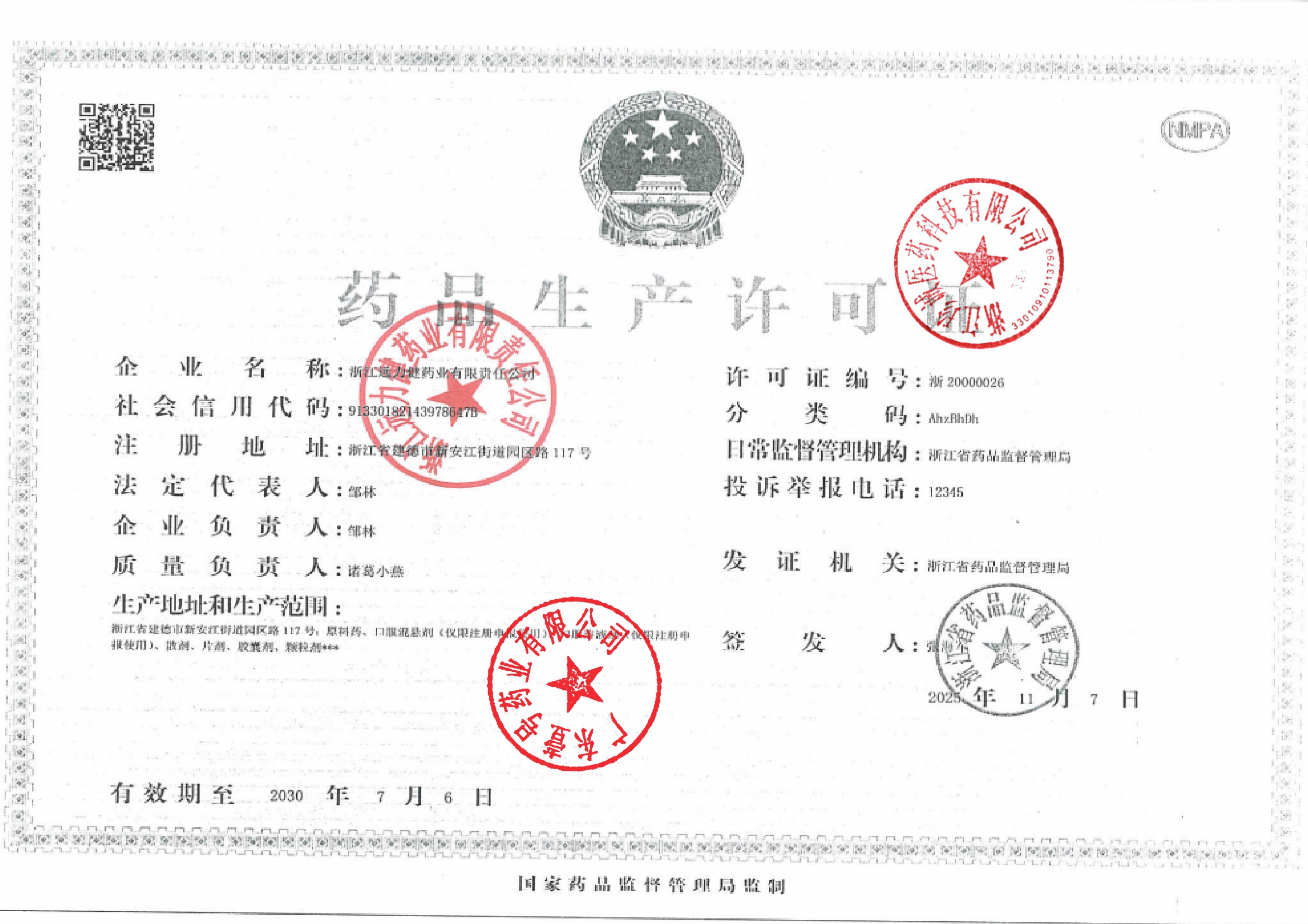 | 1 | 33000075 | 浙江远力健药业有限责任公司 | 药品生产许可证.jpg | Dec 18, 2025 10:53:01 AM | 查看下载 | |