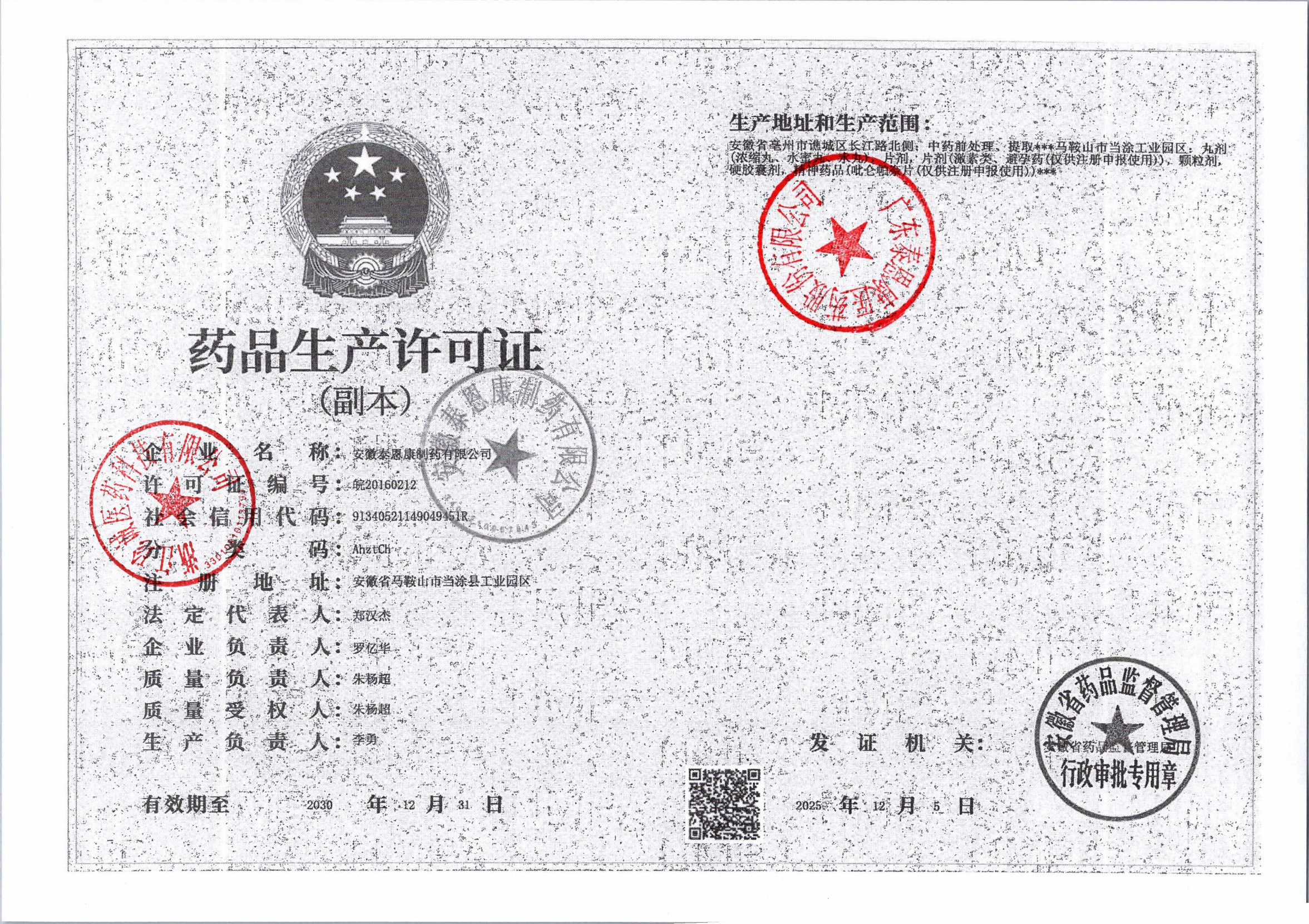 | 2 | Z99000003 | 安徽泰恩康制药有限公司(原马鞍山天福康药业有限公司) | 许可证 (2).jpg | Dec 18, 2025 9:42:06 AM | 查看下载 | |